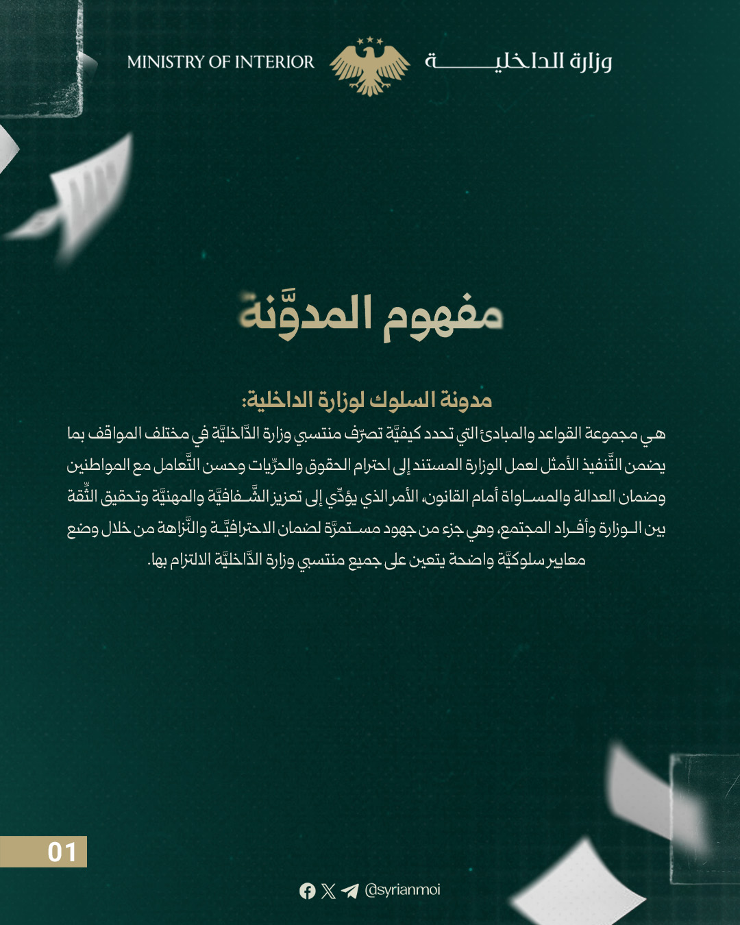 المادة (١): تعتمد مدونة السلوك الواردة أدناه كميثاق قواعد وسلوك يلتزم بها العاملون في وزارة الداخلية عسكريون ومدنيون ذكوراً وإناثاً سواء في ممارسة مهامهم الوظيفية أو خارجها.