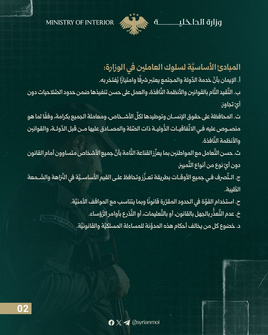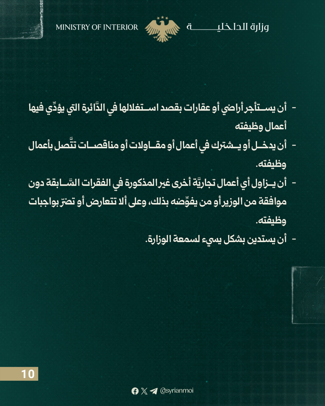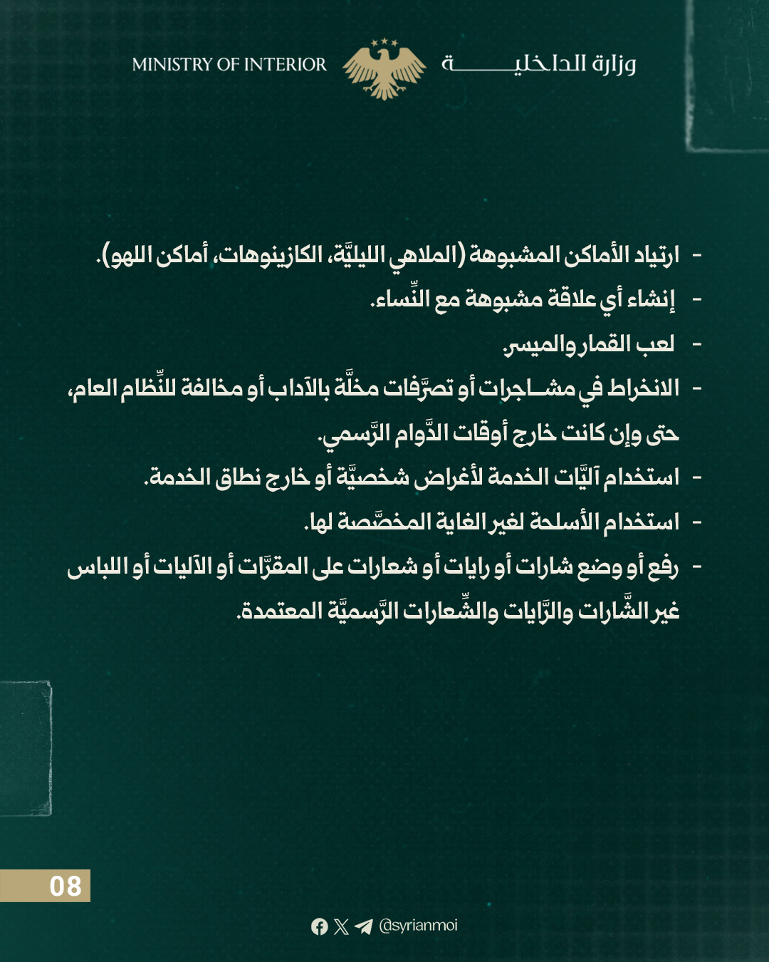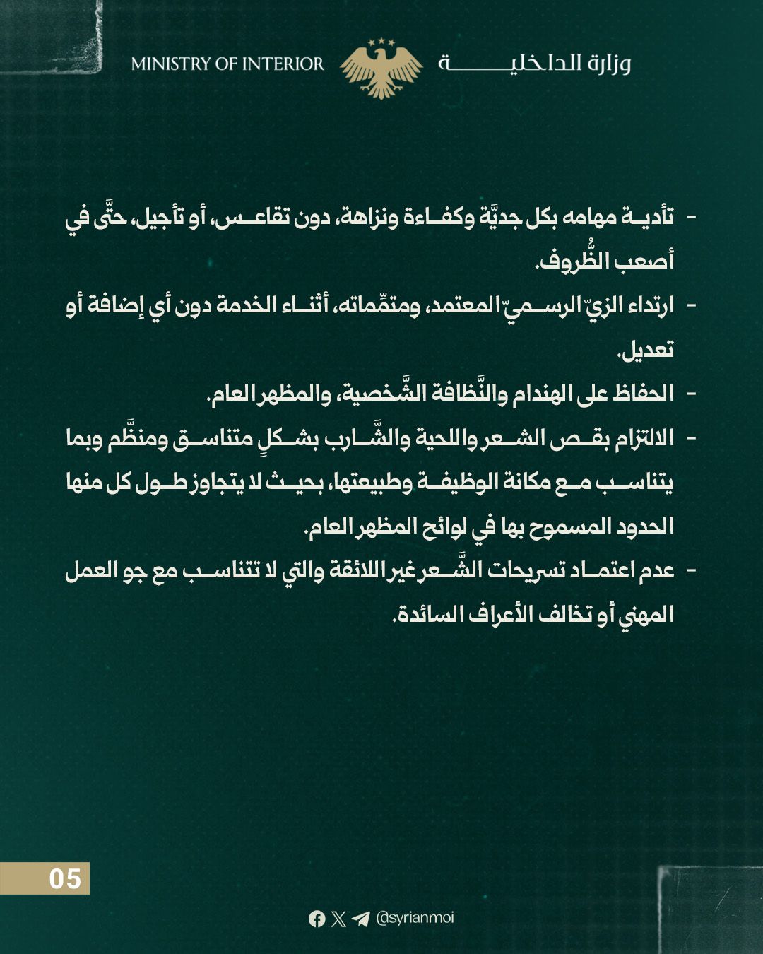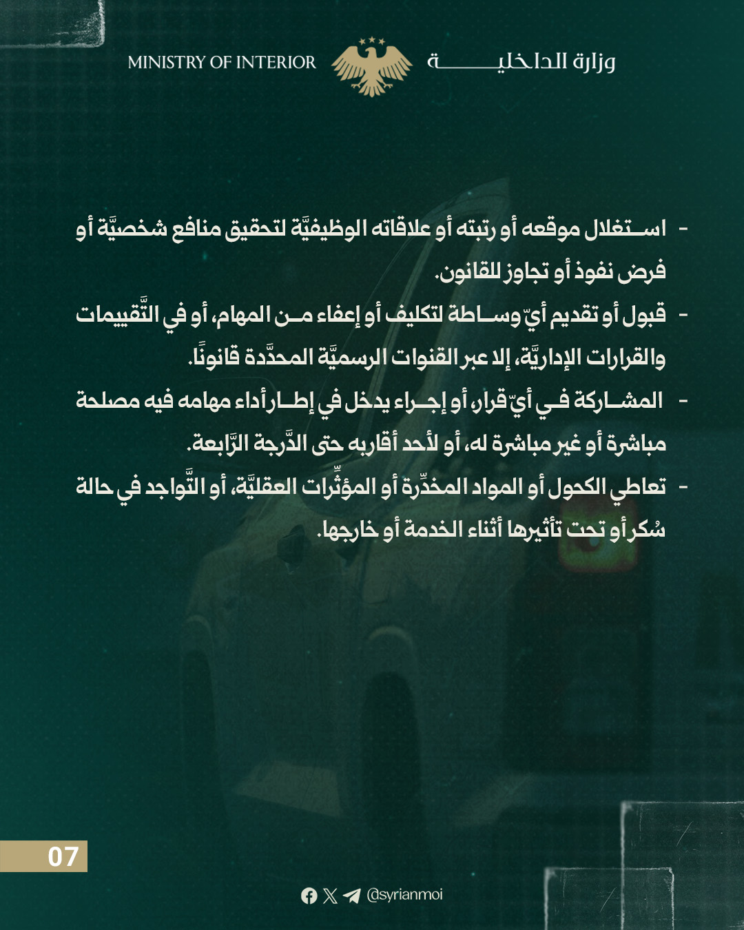 يحظر على العامل توثيق أو تصوير أو نشر أي نشاط أو موقع أو عنصر أمني أو إداري تابع للوزارة باستخدام الهاتف الشخصي أو أي جهاز تصوير دون موافقة الوزير أو من يفوضه.
