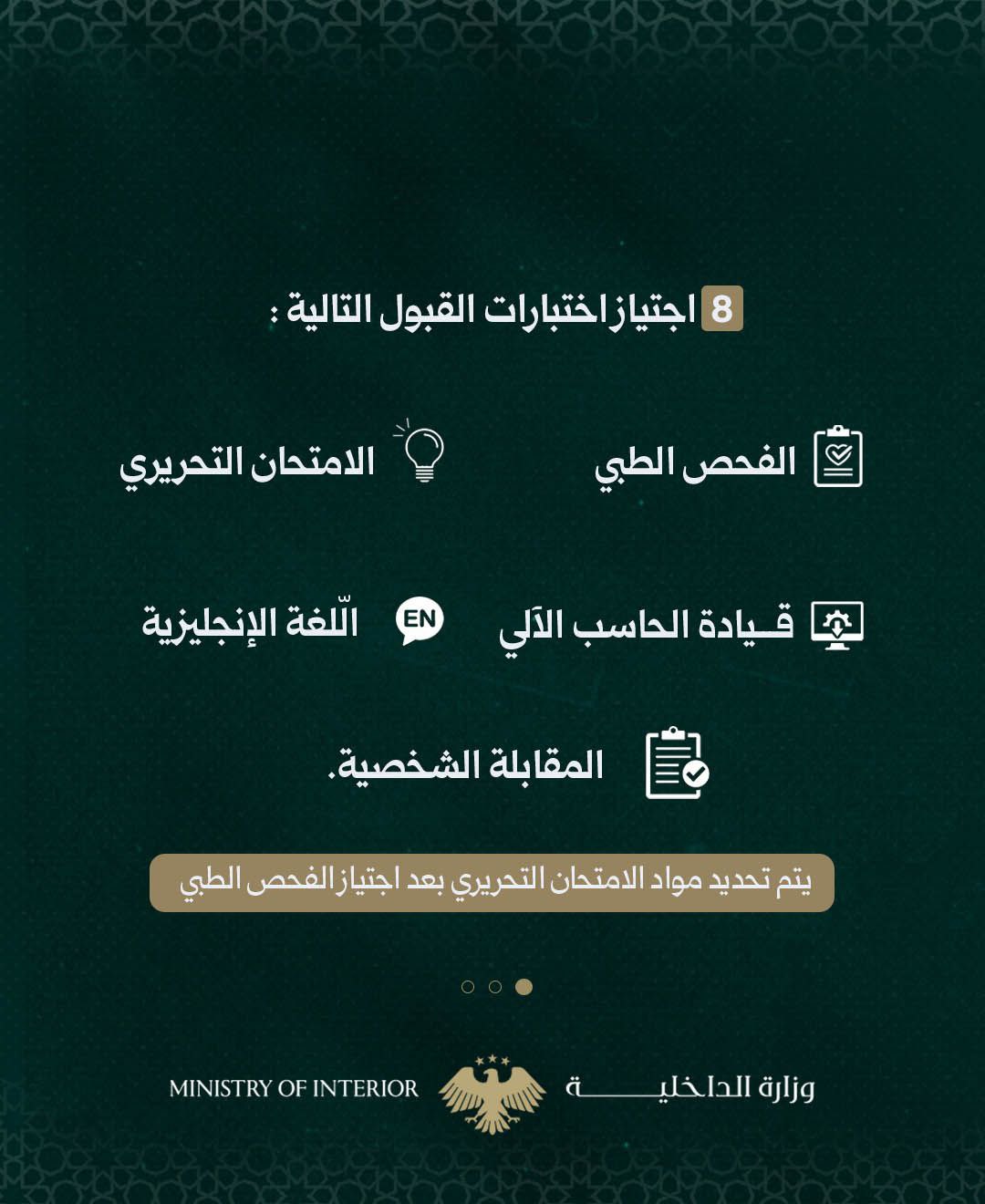 يتم تحديد مواد الامتحان التحريري بعد اجتياز الفحص الطبي