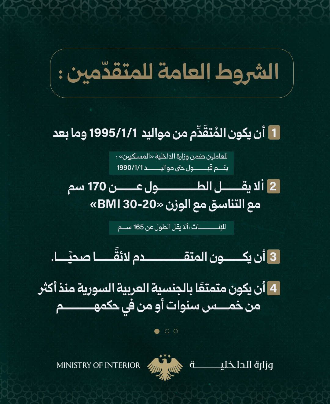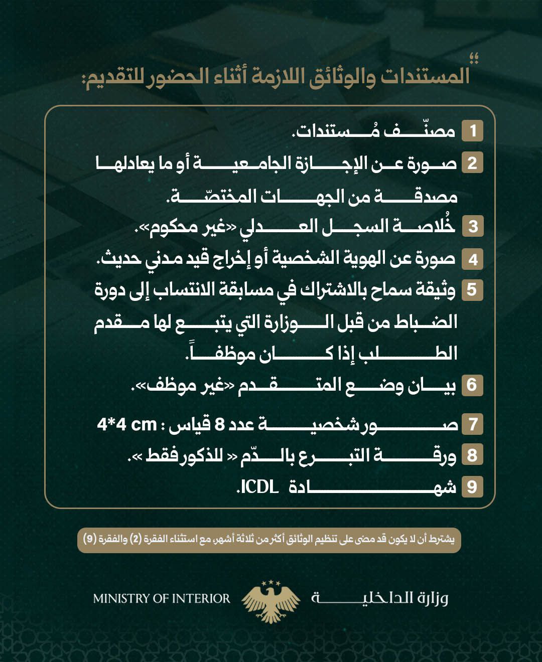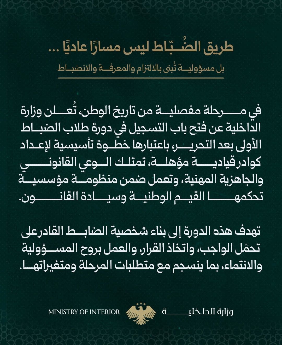وزارة الداخلية تعلن فتح باب التسجيل في دورة طلاب الضباط الأولى بعد التحرير لعام 2026