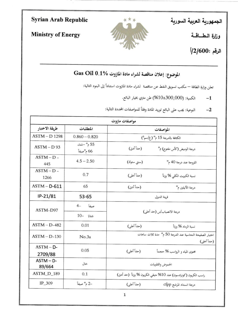 مكتب تسويق النفط في وزارة الطاقة: الإعلان عن مناقصة لشراء مادة المازوت (Gas Oil 0.1%) بكمية 300,000 طن متري وفق مواصفات فنية وتسعير بلاتس