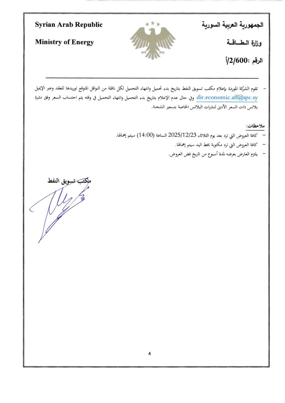 وسيتم فض العروض في مبنى وزارة الطاقة – مكتب تسويق النفط بحضور العارضين أو من يمثلهم يوم الثلاثاء 2025/12/23 الساعة /15:00/ بتوقيت دمشق.