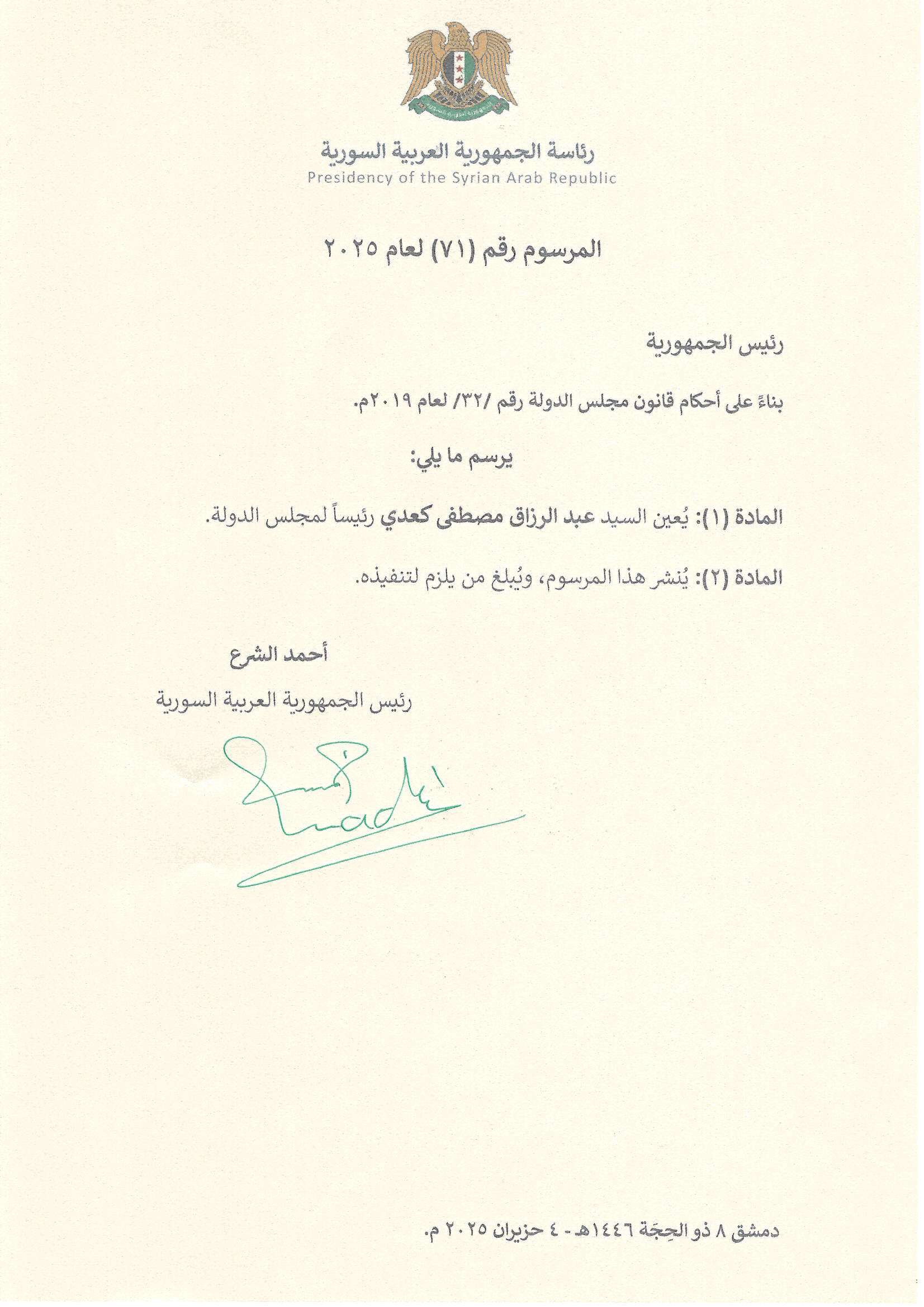 المرسوم 71 لعام 2025: تعيين عبد الرزاق مصطفى كعدي رئيس لمجلس الدولة