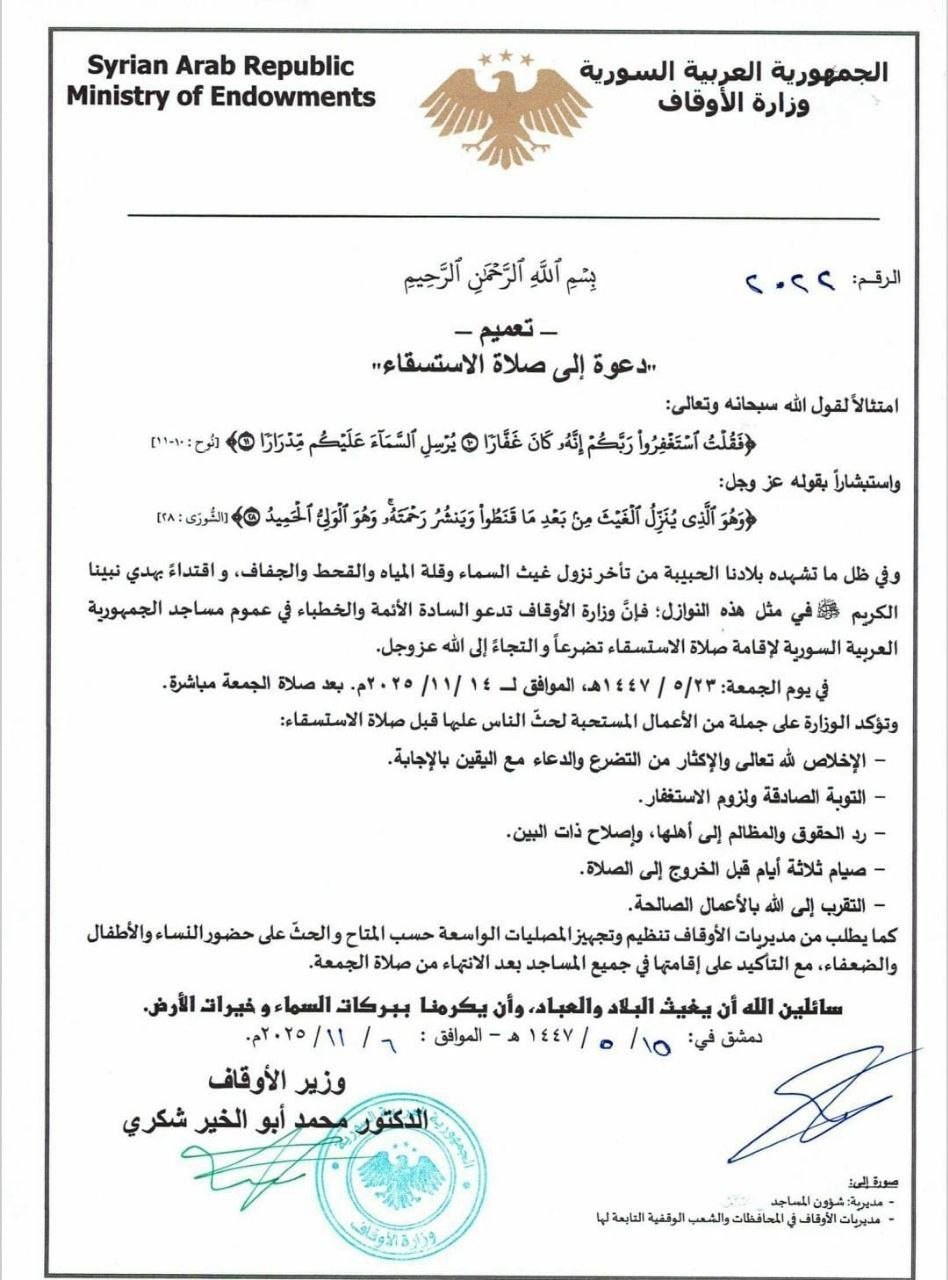 وفي ظل ما تشهده بلادنا الحبيبة من تأخر نزول غيث السماء وقلة المياه والقحط والجفاف، واقتداءً بهدي نبينا الكريم ﷺ في مثل هذه النوازل، فإن وزارة الأوقاف تدعو السادة الأئمة والخطباء في عموم مساجد الجمهورية العربية السورية لإقامة صلاة الاستسقاء تضرعًا والتجاءً إلى الله عز وجل.