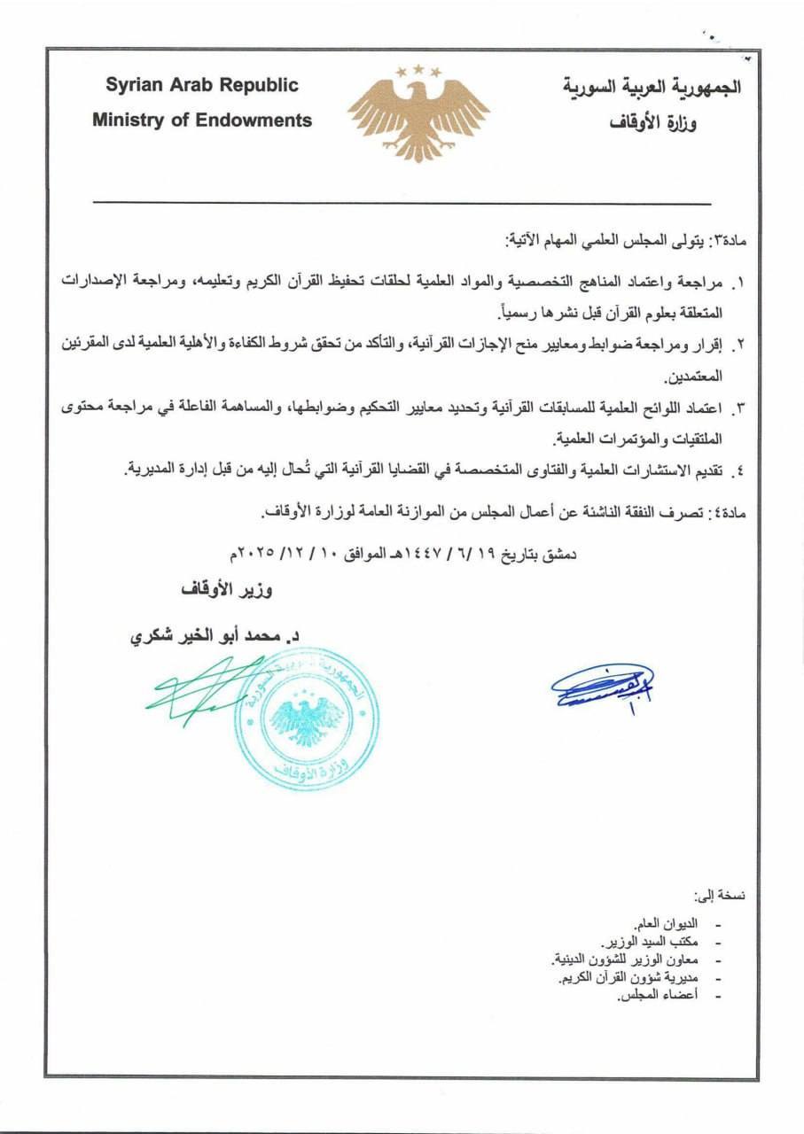 مادة /١/: يُشكّل في وزارة الأوقاف مجلس علمي لشؤون القرآن الكريم.