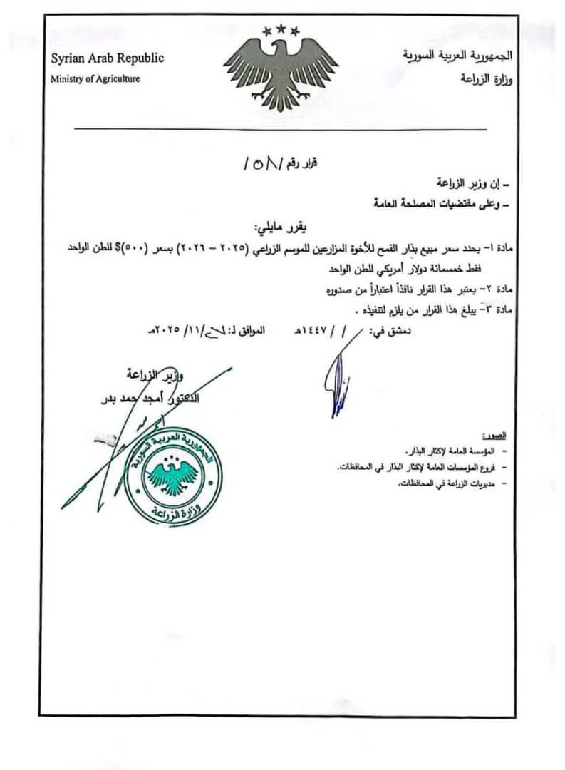 وزارة الزراعة: قرار رقم /58/ بتحديد سعر مبيع بذار القمح للأخوة المزارعين للموسم الزراعي 2025–2026