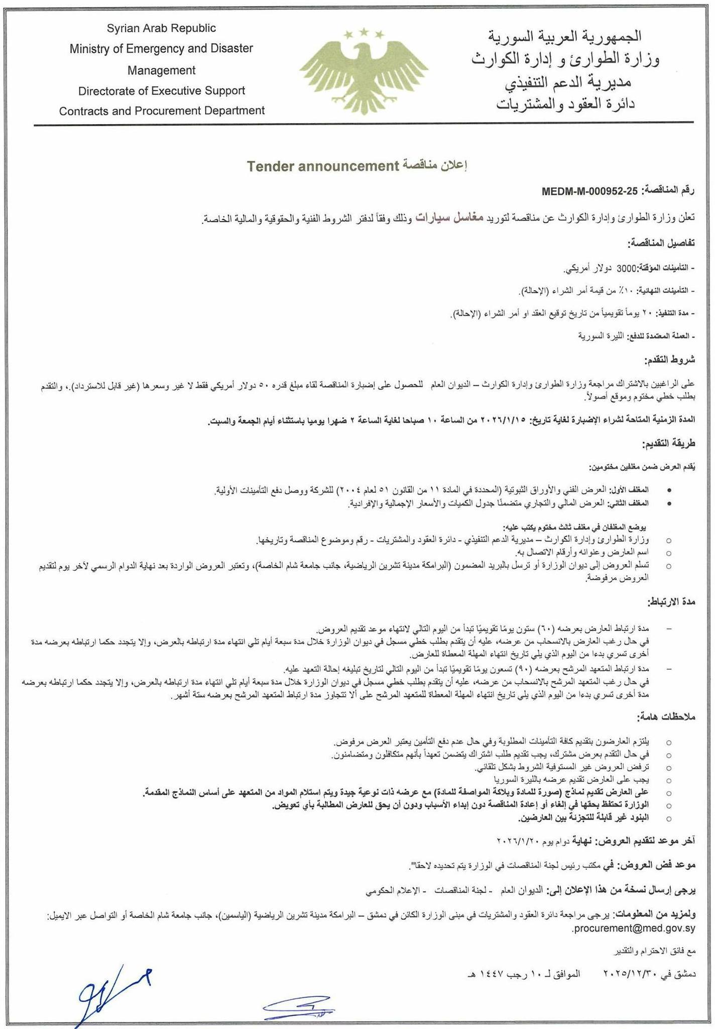وزارة الطوارئ وإدارة الكوارث: إعلان مناقصة لتوريد مفاصل سيارات