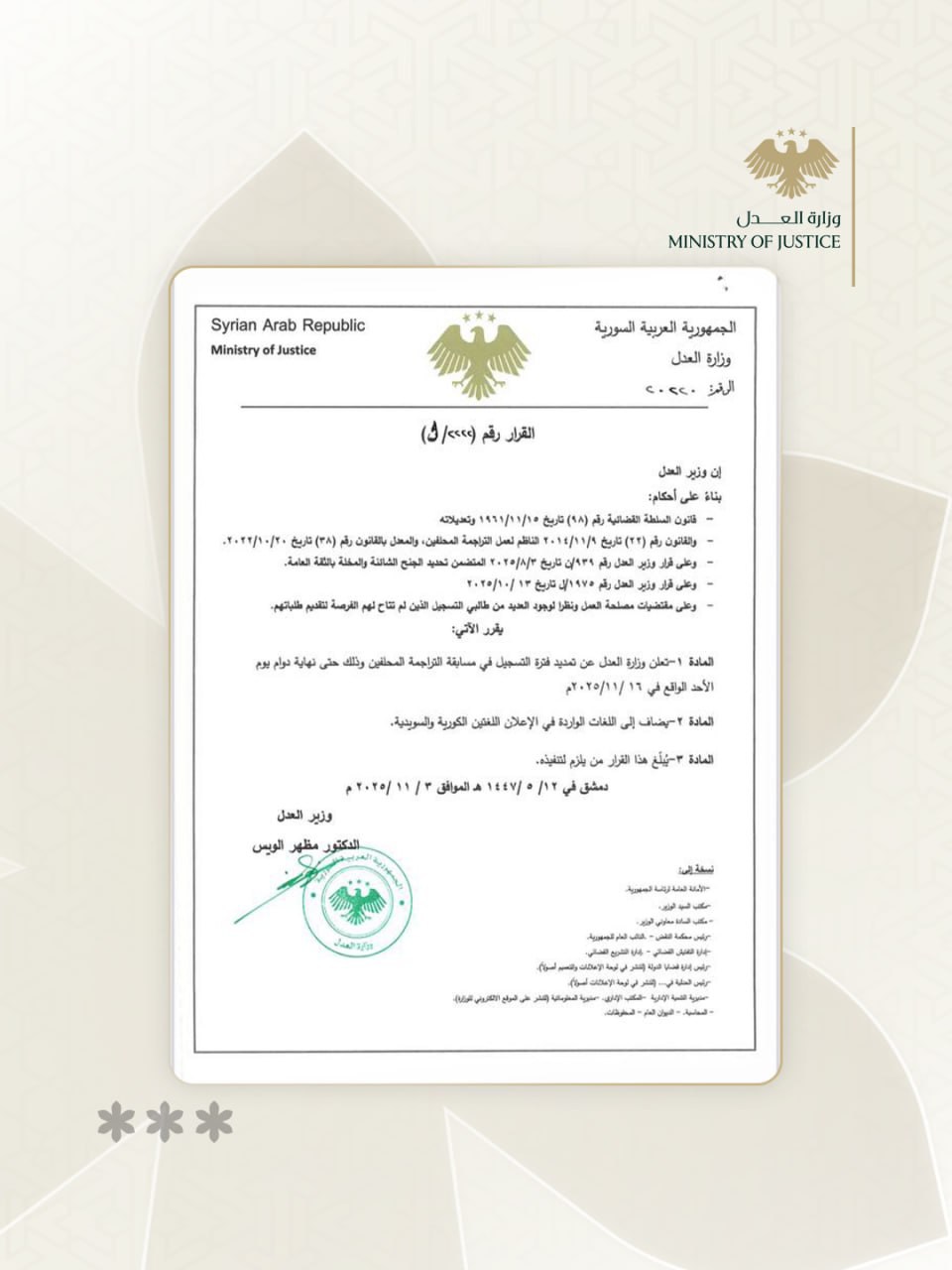 * وعلى قرار وزير العدل رقم /1975/ تاريخ 3/1/2025.
