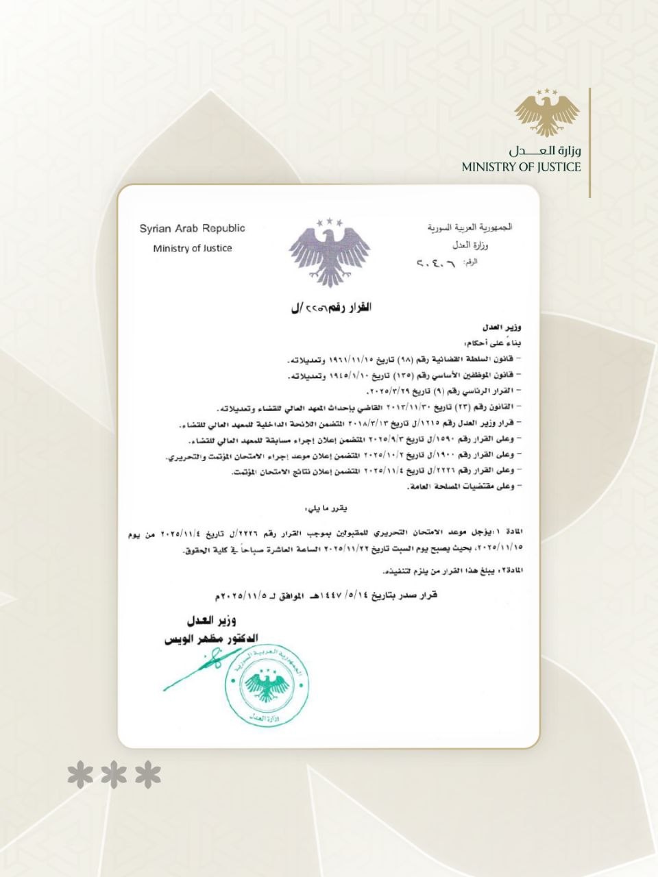 * وعلى القرار رقم /1590/ل تاريخ 9/9/2025 المتضمن إعلان إجراء مسابقة المعهد العالي للقضاء.