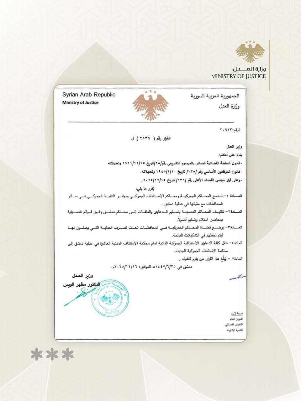 * وعلى قرار مجلس القضاء الأعلى رقم /263/ تاريخ 15/11/2025.