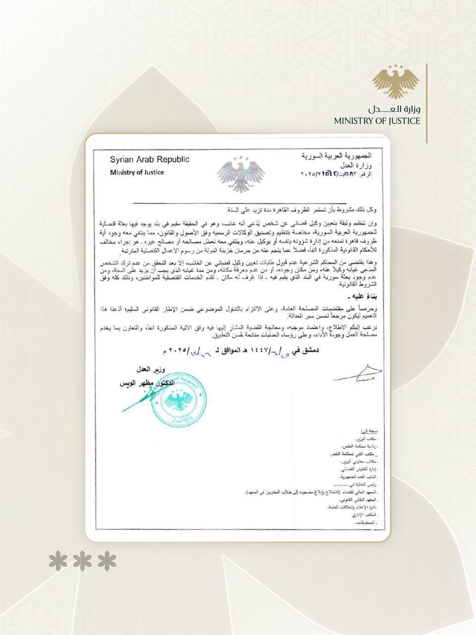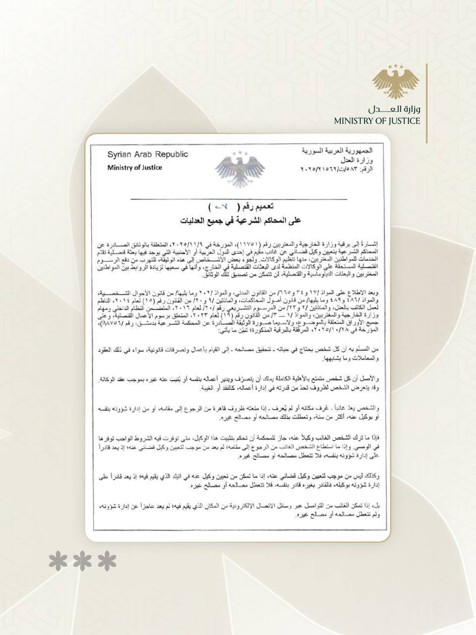 إشارة إلى برقية وزارة الخارجية والمغتربين رقم (١١٧٥) المؤرخة في 9/11/2025، والمتعلقة بالوثائق الصادرة عن المحاكم الشرعية في سورية والمقدمة من المواطنين السوريين المقيمين خارج القطر أو المتعذر حضورهم، والتي تتضمن تنظيم وكالات، ولجوء بعض الأشخاص إلى هذه الوثائق للتهرب من دفع الرسوم القنصلية المستحقة في البعثات السورية في الخارج، وبما أن من شأن ذلك الإضرار بالإيرادات العامة للدولة وتعطيل مصالح المواطنين المقيمين في الخارج، والبعثات الدبلوماسية والقنصلية التي تتولى تصديق تلك الوثائق.
