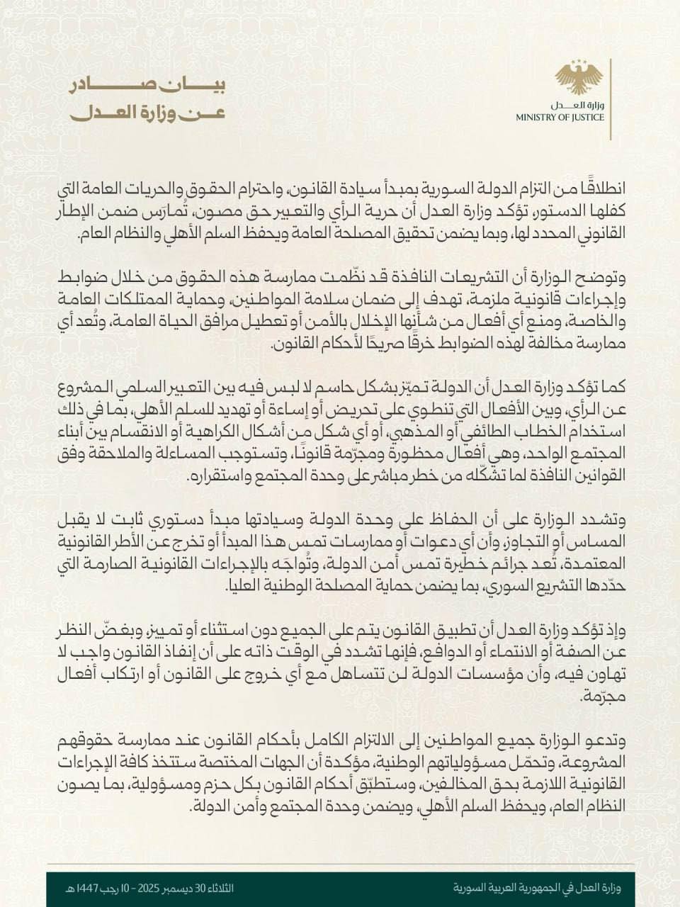انطلاقاً من التزام الدولة السورية بمبدأ سيادة القانون، واحترام الحقوق والحريات العامة التي كفلها الدستور، تؤكد وزارة العدل أن حرية الرأي والتعبير حق مصون، تمارس ضمن الإطار القانوني المحدد لها، وبما يضمن تحقيق المصلحة العامة ويحفظ السلم الأهلي والنظام العام.