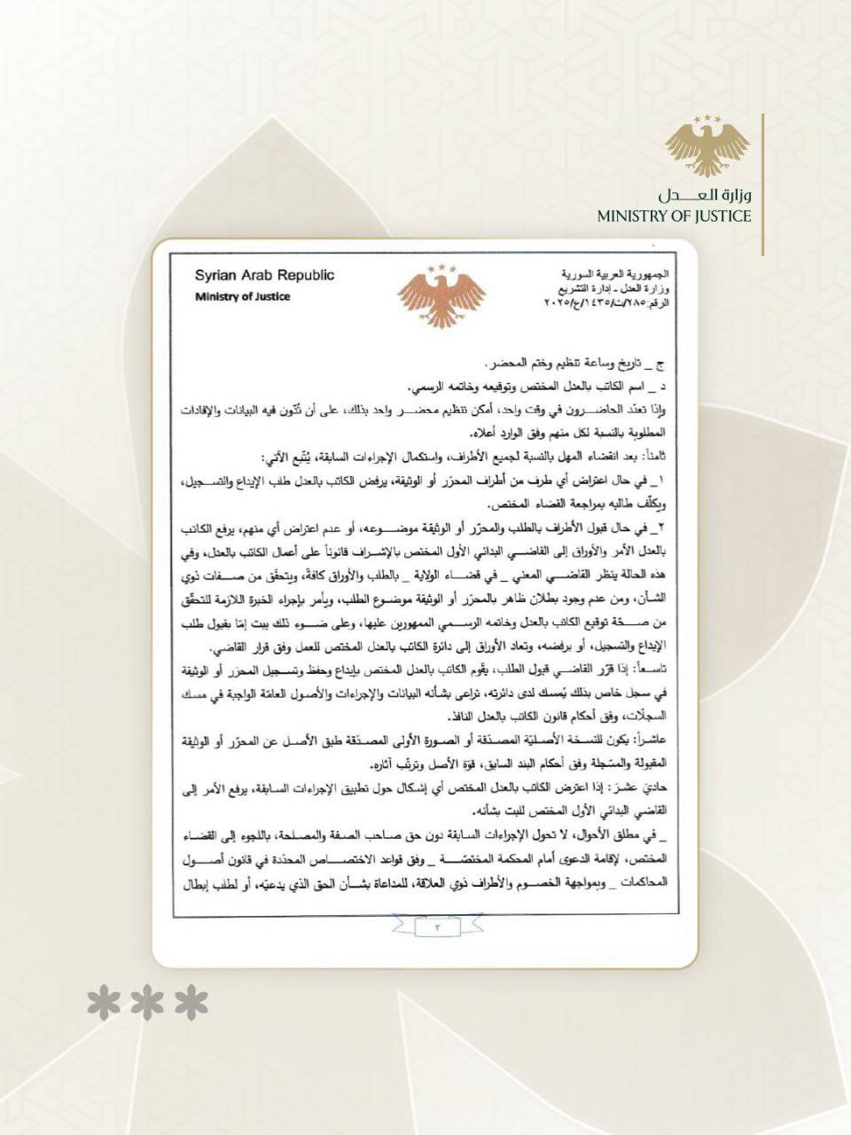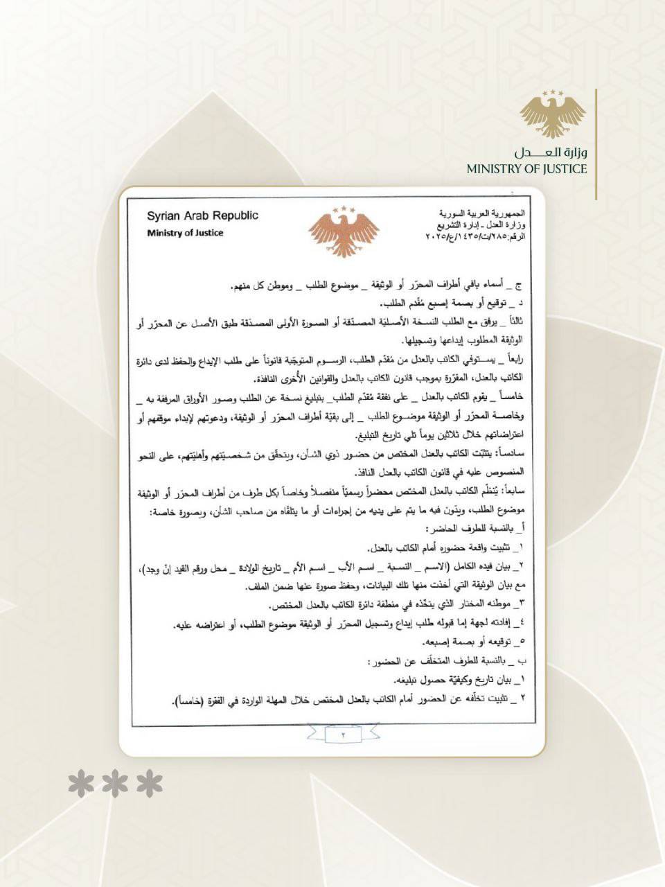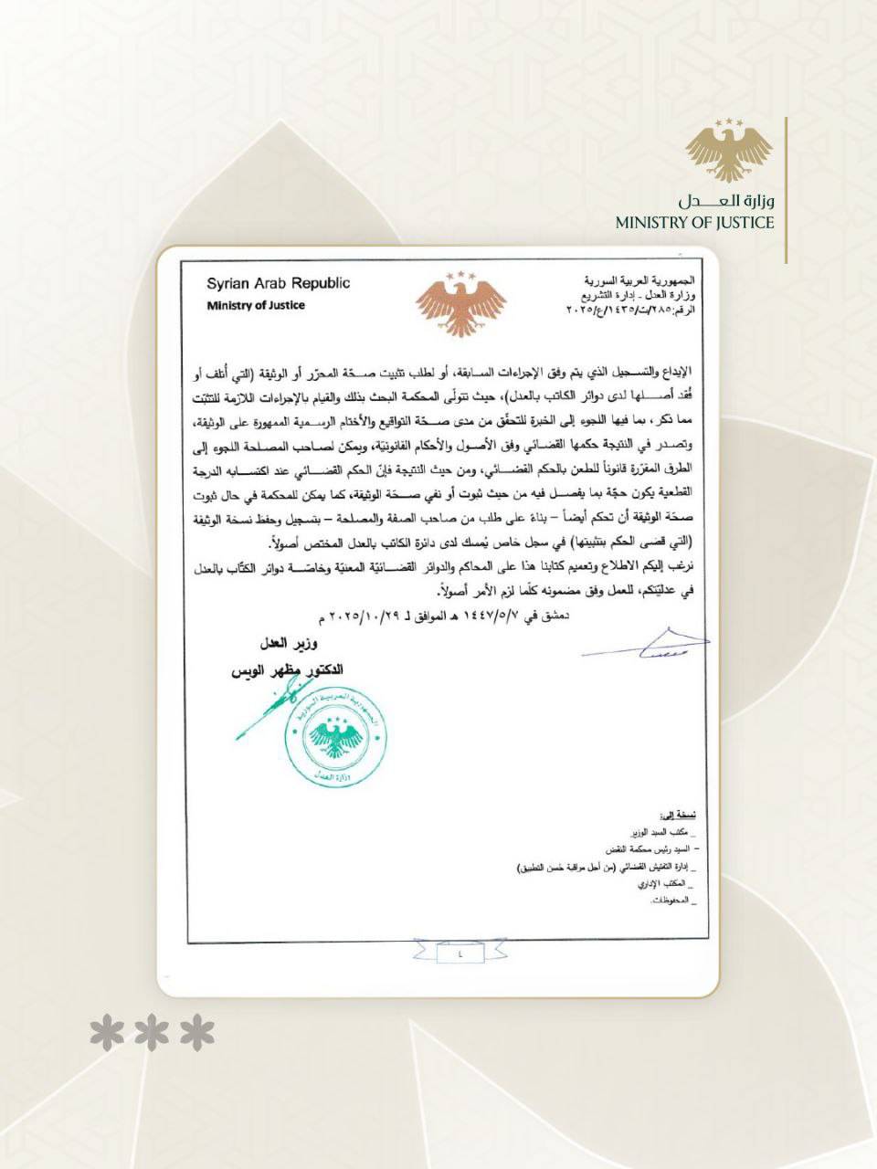 نرغب إليكم الاطلاع وتعميم ذلك كلياً على المحاكم والدوائر القضائية المعنية وخاصة دوائر الكاتب بالعدل في عدالتكم، للعمل وفق مضمونه كلما لزم الأمر أصولاً.