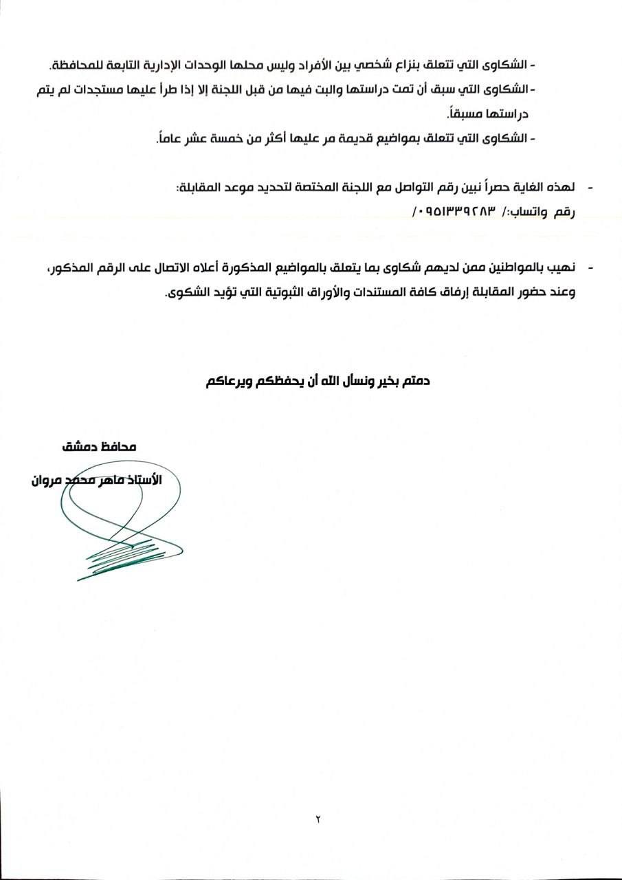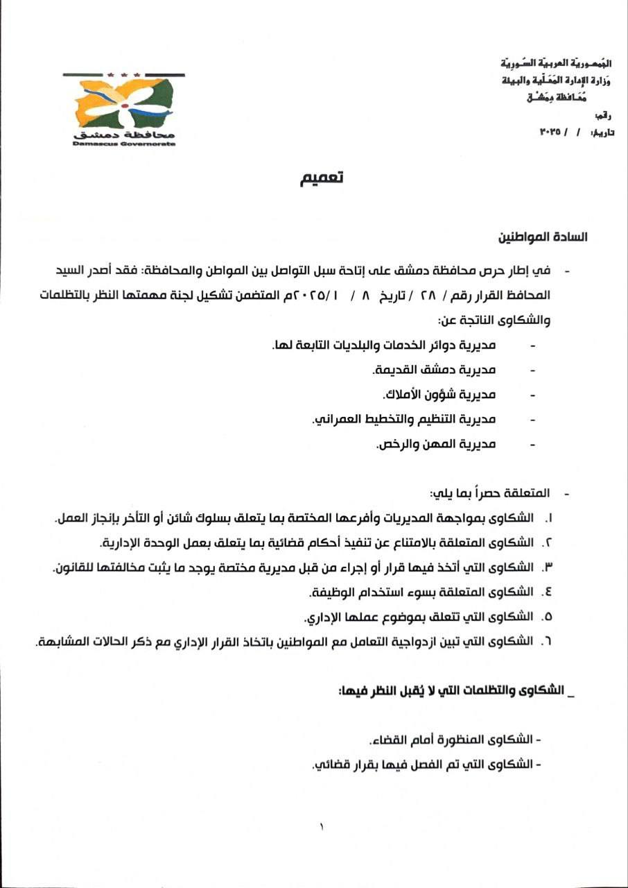محافظة دمشق: تعميم رقم 28 حول استقبال الشكاوى والتظلمات وضوابط النظر فيها
