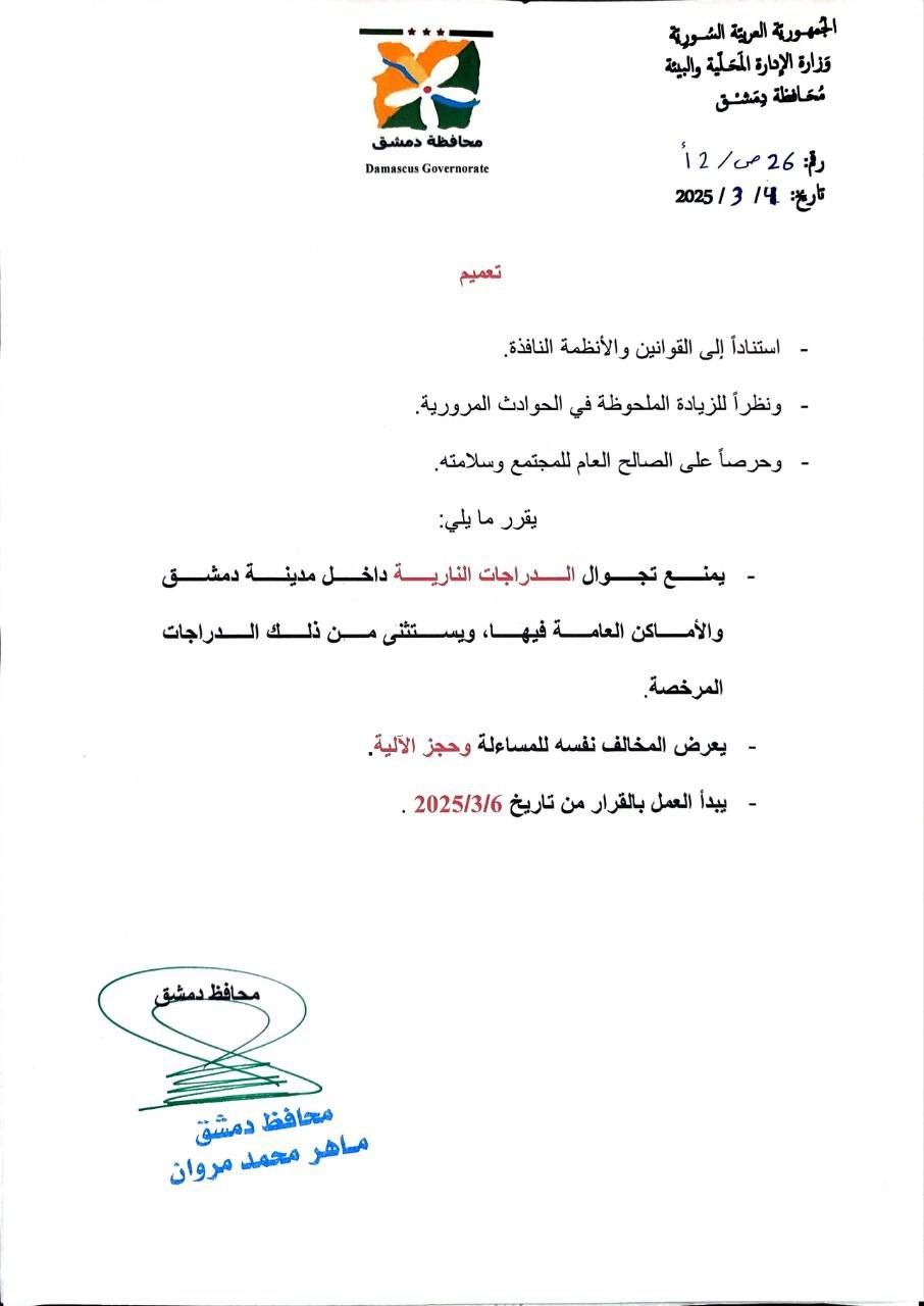 * يمنع تجوال **الدراجات النارية** داخل مدينة دمشق والأماكن العامة فيها، ويستثنى من ذلك الدراجات المرخصة.