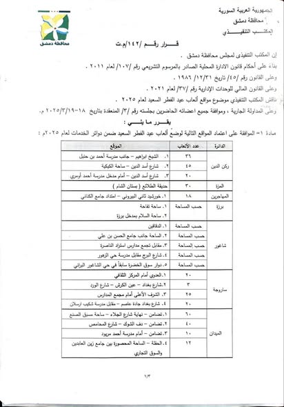 يكلف قسم شرطة مجلس محافظة دمشق بوضع دوريات ثابتة في جميع المواقع المعتمدة سابقاً فيها قبل /24/ ساعة من العيد لمنع توضع أية ألعاب غير مرخصة.