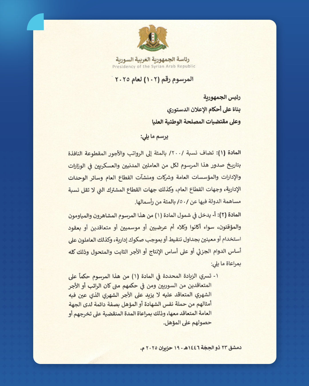 المرسوم 102 لعام 2025: زيادة الرواتب والأجور بنسبة 200% ورفع الحد الأدنى للأجور إلى 750 ألف ليرة