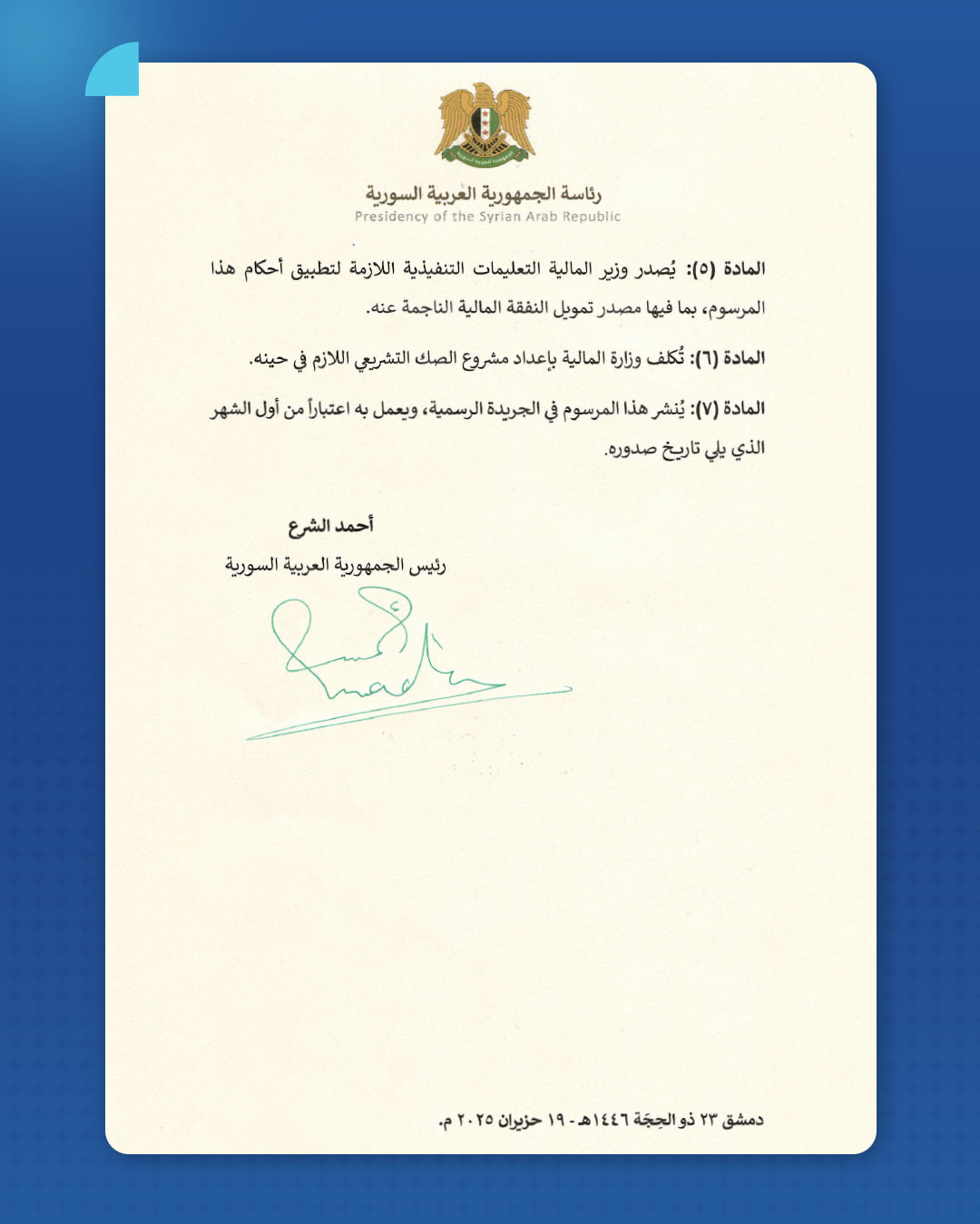 يصدر وزير المالية التعليمات التنفيذية اللازمة لتطبيق أحكام هذا المرسوم، بما فيها مصدر تمويل النفقة المالية الناجمة عنه.