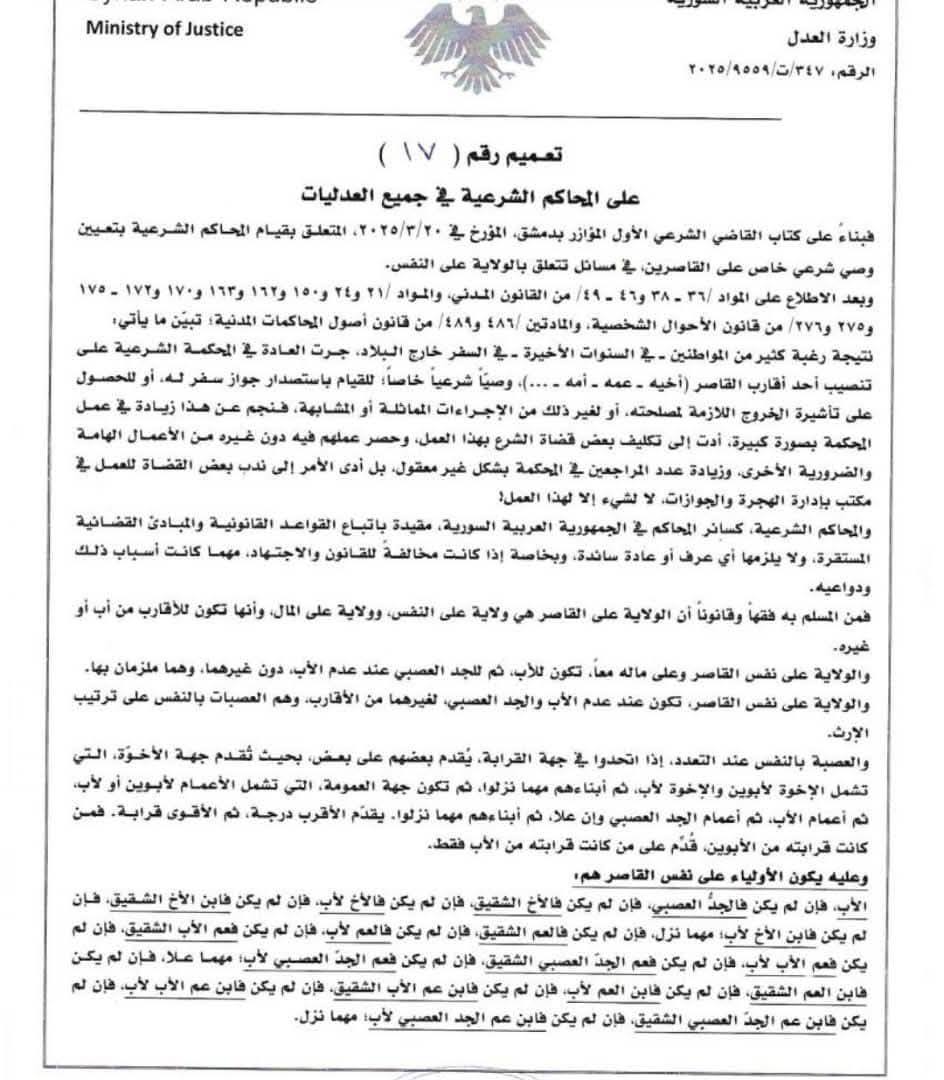 بناء على كتاب القاضي الشرعي الأول لدمشق المتزوج في ٢٠٢٥/٣/٢، المتعلق بقيام المحاكم الشرعية بتعيين قيّمين شرعيين على القاصرين بخصوص مسائل تتعلق بالولاية على النفس.