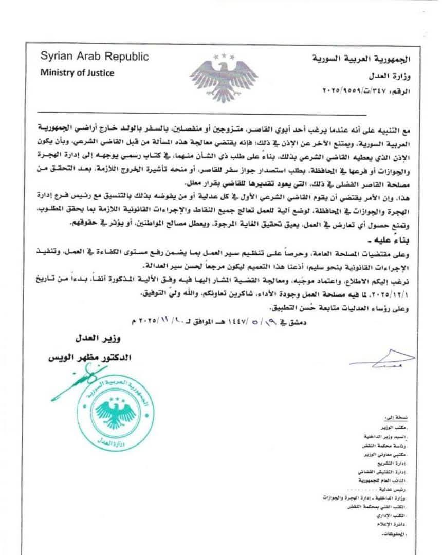 مع التأكيد على أنه عندما يرغب أحد أبوي القاصر متزوجين أو منفصلين، بالسفر بالولد خارج أراضي الجمهورية العربية السورية ويرافقه دون عمر الإذن له بذلك، فإنه يتوجب معالجة هذه المسألة من قبل القاضي الشرعي، وبين أن يكون الإذن الذي يصدره القاضي الشرعي بذلك، بناء على طلب ذي الشأن نفسها، على كتاب رسمي يوجه إلى إدارة الهجرة والجوازات في المحافظة، بطلب إصدار جواز سفر للقاصر، أو منحه تأشيرة الخروج اللازمة، بعد التحقق من توافر كامل الضمانات الشرعية والقانونية التي تحفظ لهذا القاصر مصلحته في هذا المجال.