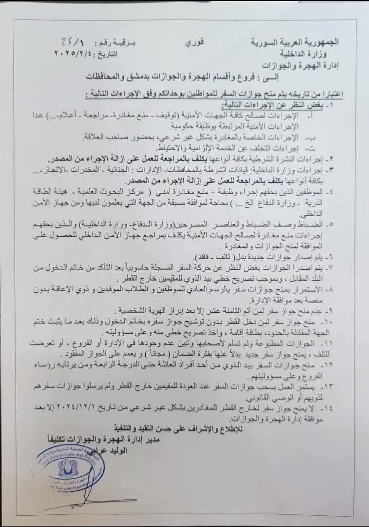 ١٤- لا يمنح جواز سفر لأحد المغادرين بشكل غير شرعي من تاريخ ٢٠٢٤/١٢/٣١ الا بعد موافقة إدارة الهجرة و الجوازات
