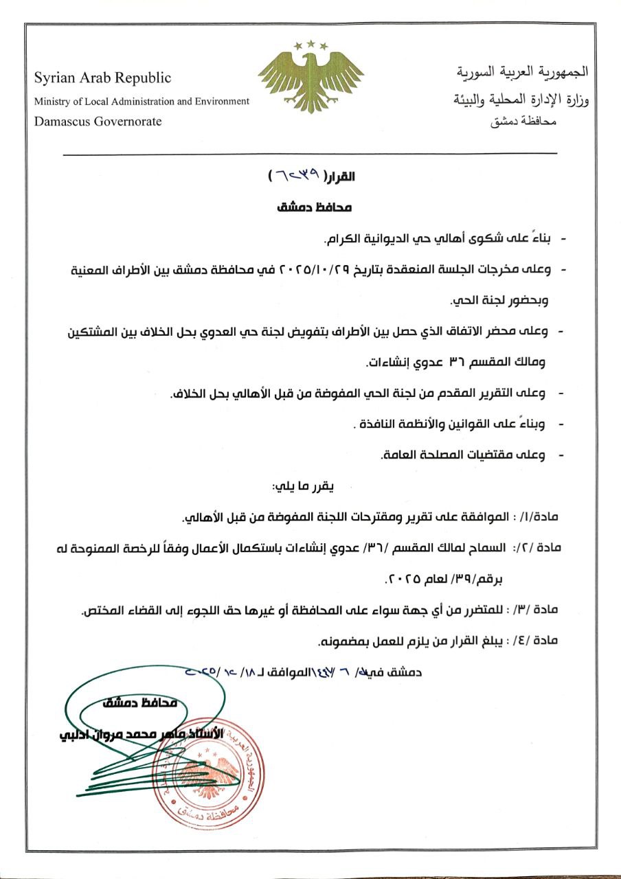 * وعلى مخرجات الجلسة المنعقدة بتاريخ 29/10/2025 في محافظة دمشق بين الأطراف المعنية وبحضور لجنة الحي.