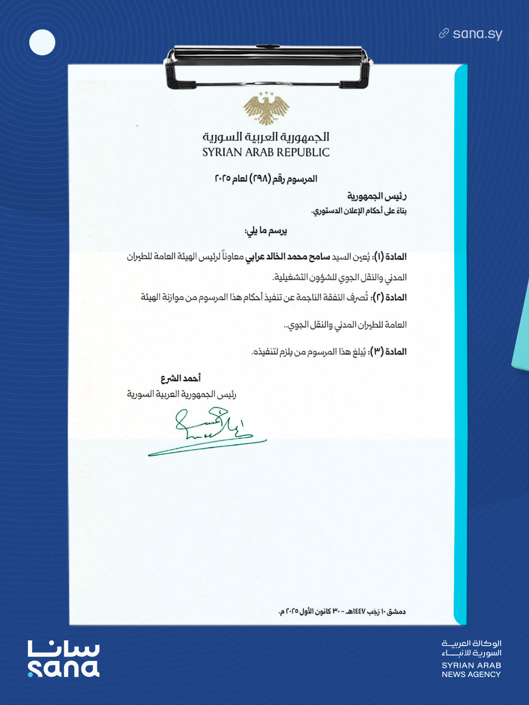 المادة (1): يُعين السيد سامح محمد الخالد عرابي معاوناً لرئيس الهيئة العامة للطيران