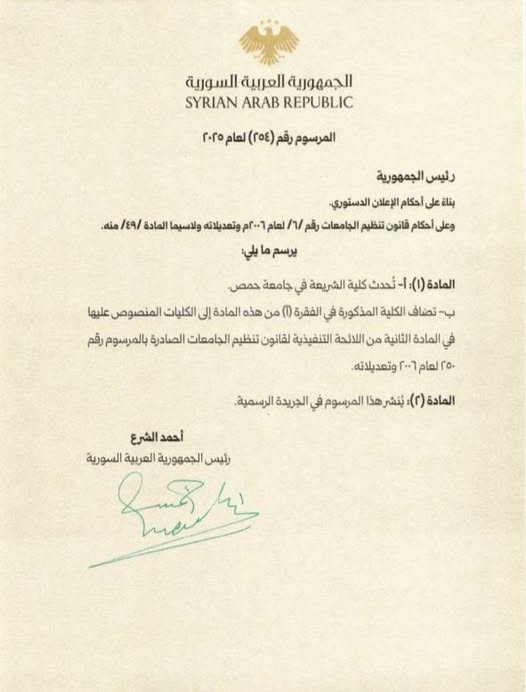 المرسوم 254 لعام 2025: إحداث كلية الشريعة في جامعة حمص