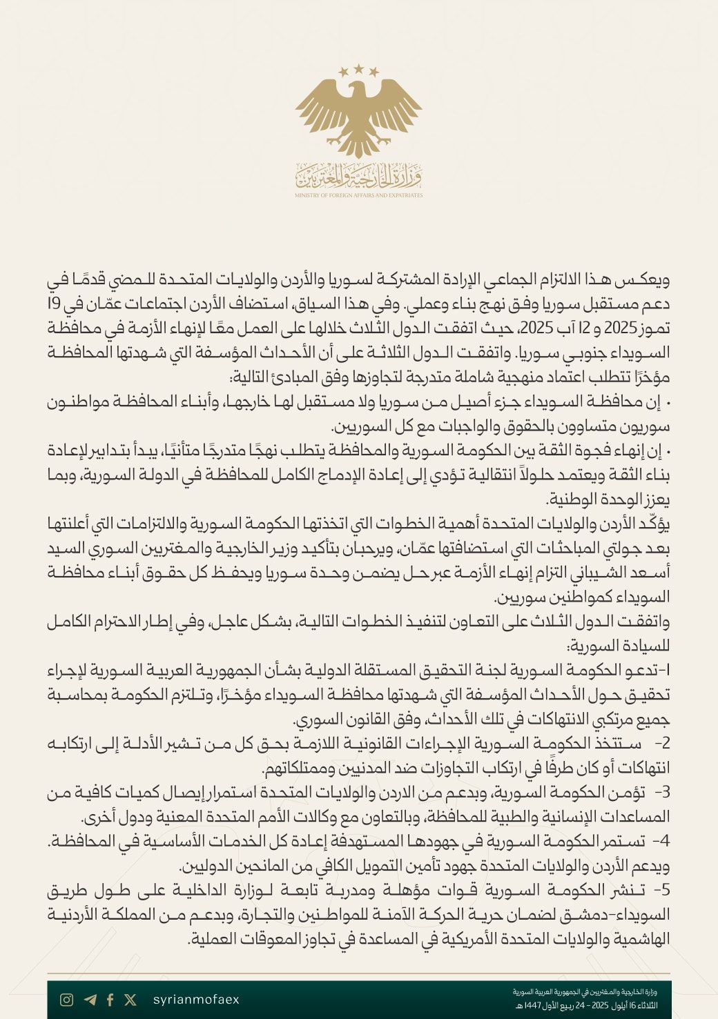 1- تدعو الحكومة السورية لجنة التحقيق المستقلة الدولية بشأن الجمهورية العربية السورية لإجراء تحقيق حول الأحداث المؤسفة التي شهدتها محافظة السويداء مؤخراً، وتلتزم الحكومة بمحاسبة جميع مرتكبي الانتهاكات في تلك الأحداث، وفق القانون السوري.