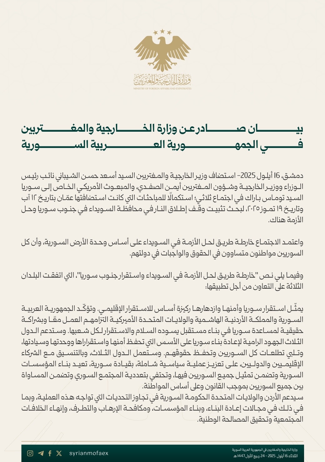 دمشق، 16 أيلول 2025 – استضاف وزير الخارجية والمغتربين السيد أسعد حسن الشيباني نائب رئيس الوزراء ووزير الخارجية وشؤون المغتربين أيمن الصفدي، والمبعوث الأمريكي الخاص إلى سوريا السيد توماس باراك في اجتماع ثلاثي، استكمالاً للمباحثات التي كانت استضافتها عمّان بتاريخ 13 آب 2025 وتاريخ 19 تموز 2025، لبحث تثبيت وقف إطلاق النار في محافظة السويداء في جنوب سوريا وحلّ الأزمة هناك.