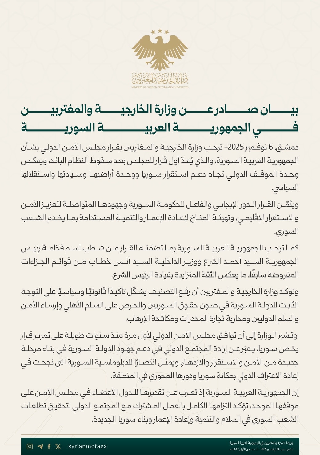 دمشق، 6 نوفمبر 2025 – ترحب وزارة الخارجية والمغتربين بقرار مجلس الأمن الدولي بشأن الجمهورية العربية السورية، والذي يُعد أول قرار للمجلس بعد سقوط النظام البائد، ويعكس وحدة الموقف الدولي تجاه دعم استقرار سوريا ووحدة أراضيها وسيادتها واستقلالها السياسي.