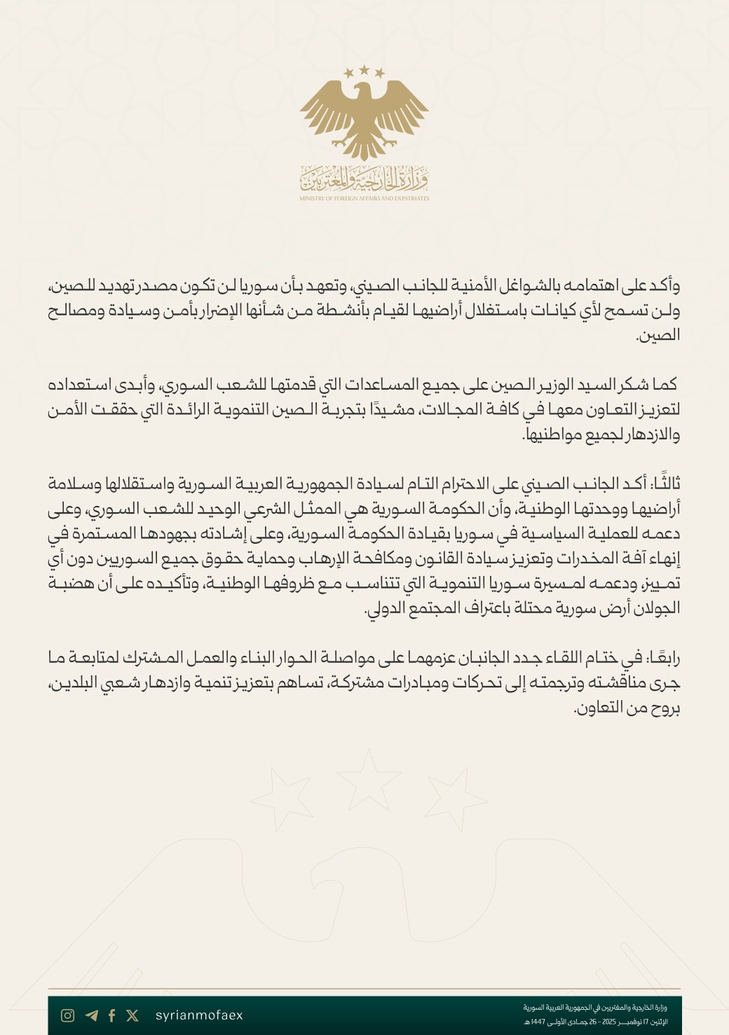 ثالثاً: أكد الجانب الصيني على الاحترام التام لسيادة الجمهورية العربية السورية واستقلالها وسلامة أراضيها ووحدتها الوطنية، وأن الحكومة السورية هي الممثل الشرعي الوحيد للشعب السوري، وعلى دعمه للعملية السياسية في سوريا بقيادة الحكومة السورية، وعلى إشادته بجهودها المستمرة في إنهاء آفة المخدرات وتعزيز سيادة القانون ومكافحة الإرهاب وحماية حقوق جميع السوريين دون أي تمييز، ودعمه لمسيرة سوريا التنموية التي تتناسب مع ظروفها الوطنية، وتأكيده على أن هضبة الجولان أرض سورية محتلة باعتراف المجتمع الدولي.