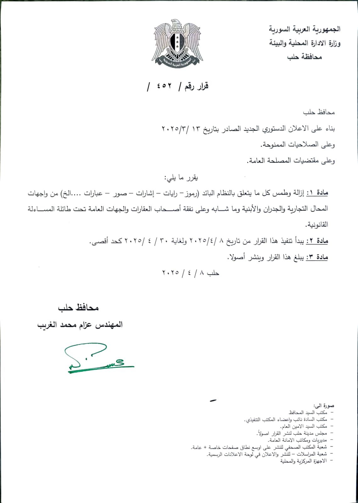 محافظة حلب: قرار رقم /452/ إزالة وطمس جميع المظاهر المخالفة للنظام العام من واجهات المحال والجدران والأبنية