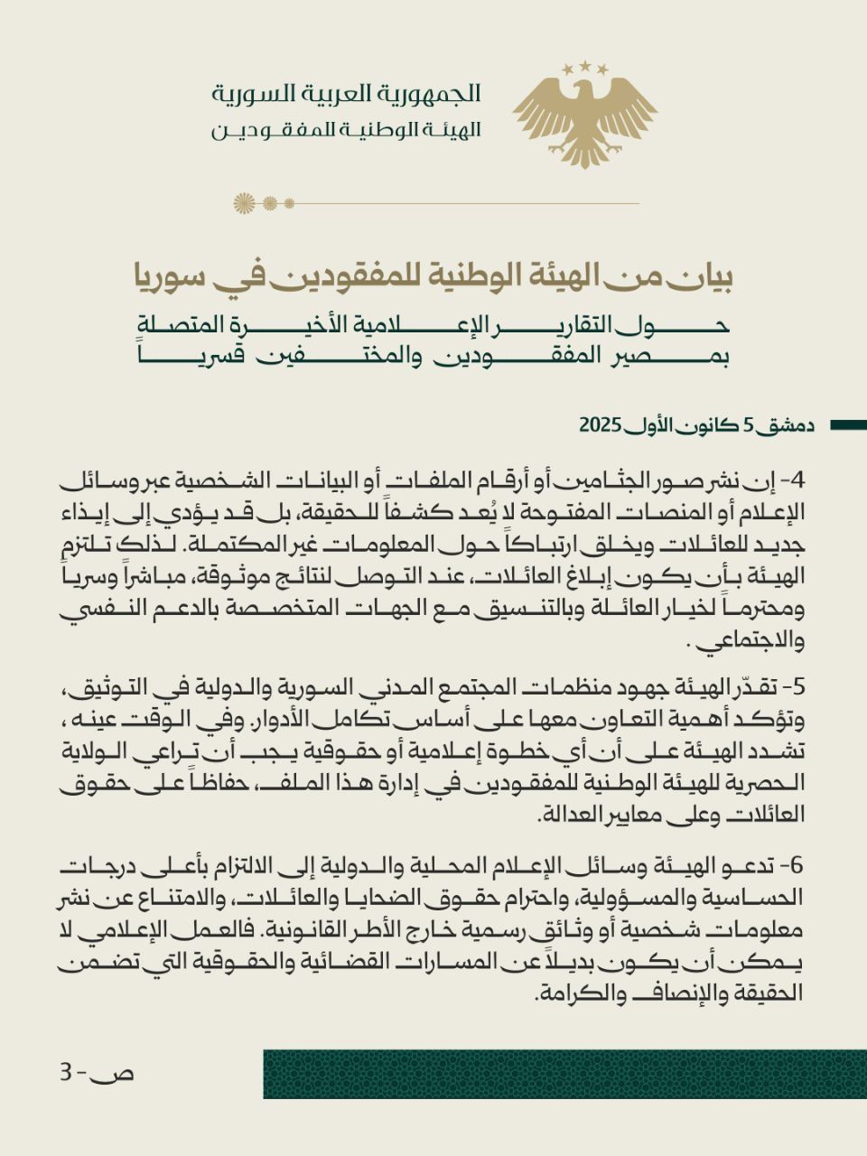 5- تقدّر الهيئة جهود منظمات المجتمع المدني السورية والدولية في التوثيق، وتؤكد أهمية التعاون معها على أساس تكامل الأدوار وفي الوقت عينه، تشدد الهيئة على أن أي خطوة إعلامية أو حقوقية يجب أن تراعي الولاية الحصرية للهيئة الوطنية للمفقودين في إدارة هذا الملف، حفاظًا على حقوق العائلات وعلى معايير العدالة.