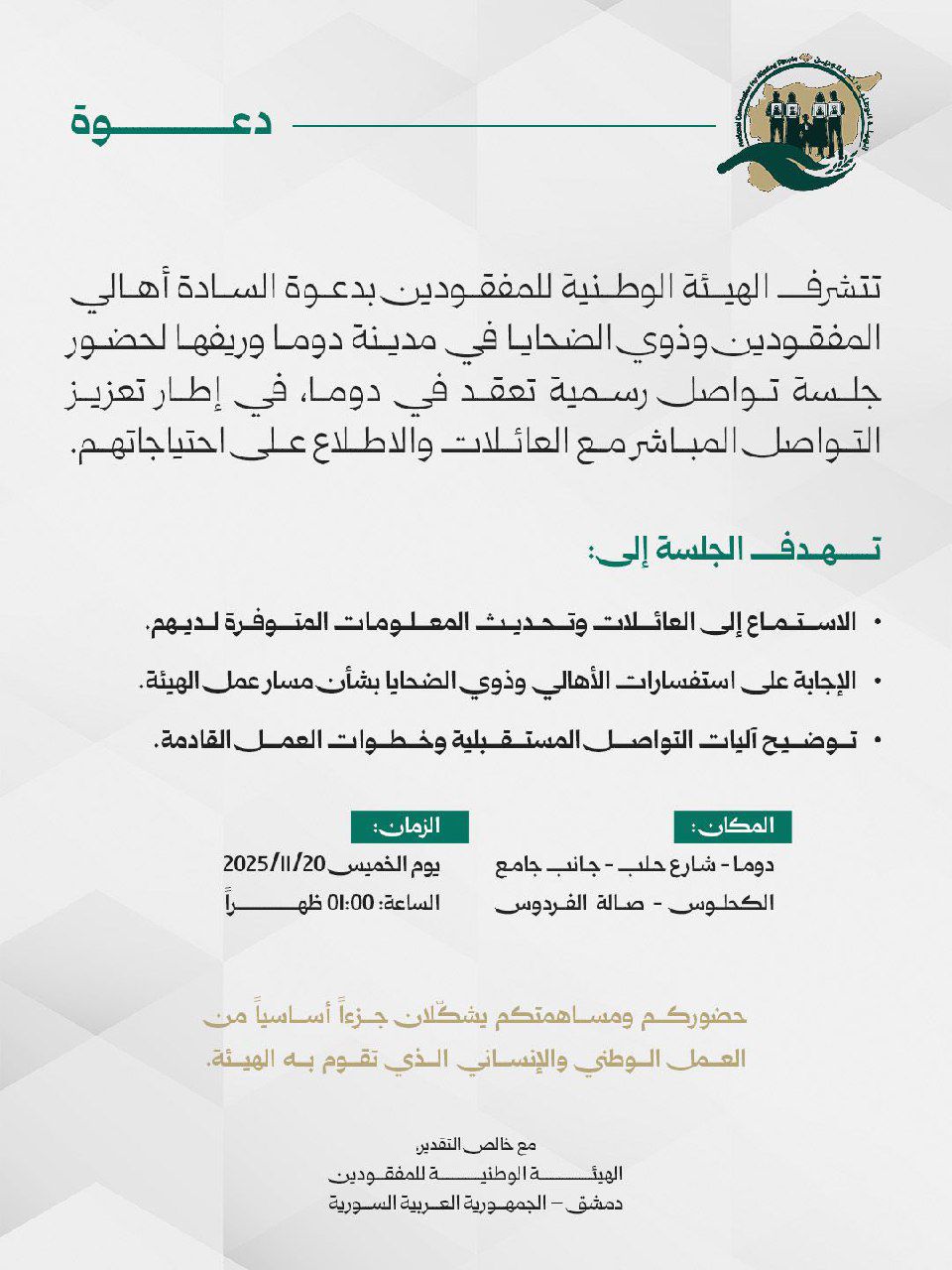 تتشرف الهيئة الوطنية للمفقودين بدعوة السادة أهالي المفقودين وذوي الضحايا في مدينة دوما وريفها لحضور جلسة تواصل رسمية تُعقد في دوما، في إطار تعزيز التواصل المباشر مع العائلات، والاطلاع على احتياجاتهم.