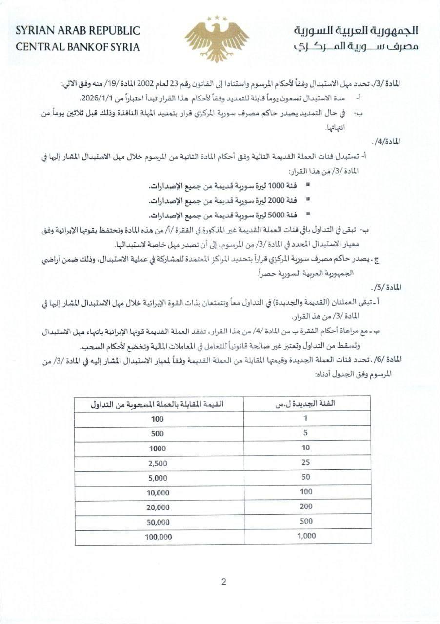 تبدأ عملية استبدال العملة القديمة اعتبارًا من صباح يوم الخميس الواقع في 1/1/2026، وتطرح عملة سورية جديدة بإزالة صفرين من القيمة الاسمية للعملة القديمة، وفق معيار الاستبدال المحدد في المادة /3/ من المرسوم (كل 100 ليرة سورية من العملة القديمة تعادل 1 ليرة سورية من العملة الجديدة).