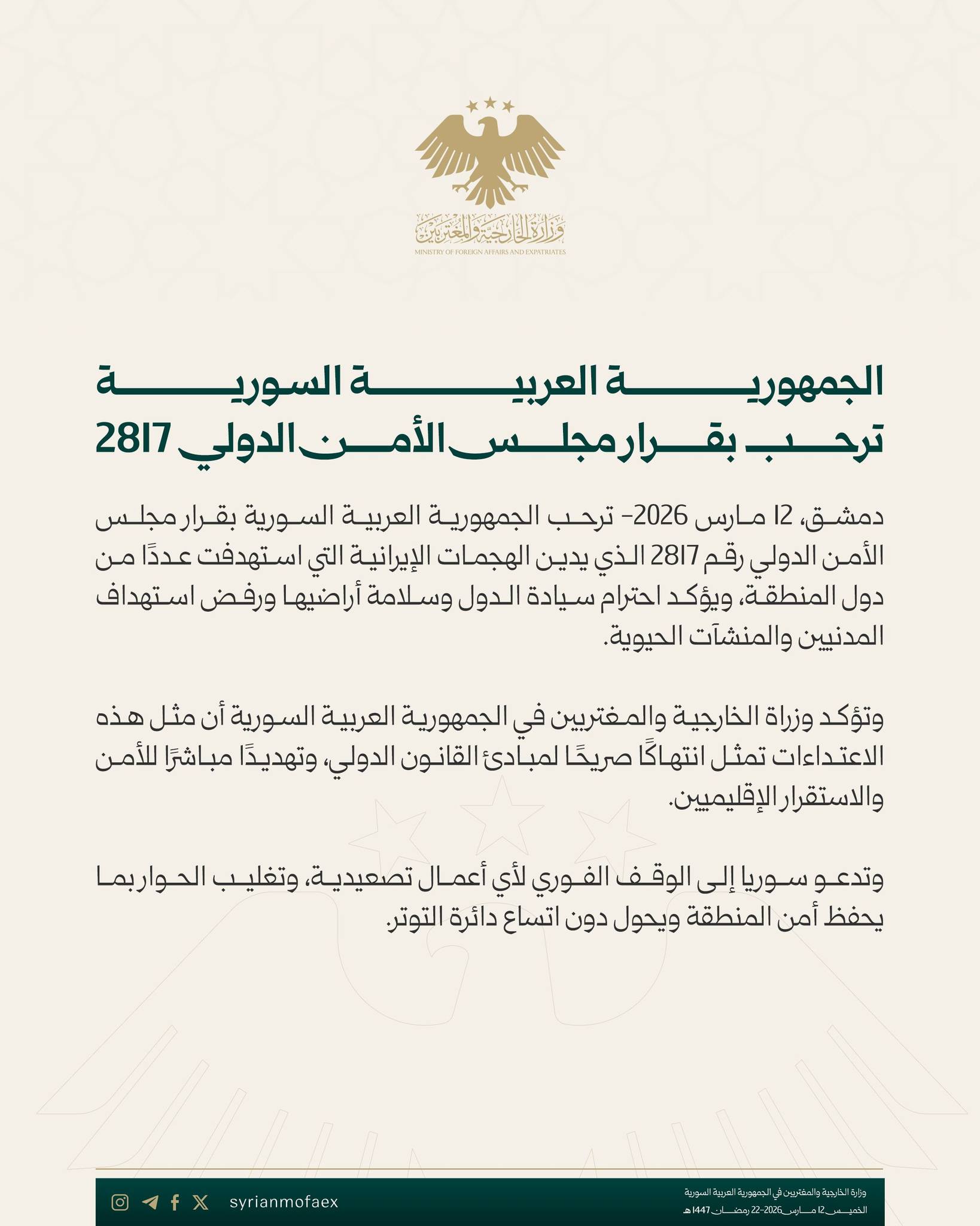 دمشق، 12 مارس 2026- ترحب الجمهورية العربية السورية بقرار مجلس الأمن الدولي رقم 2817 الذي يدين الهجمات الإيرانية التي استهدفت عدداً من دول المنطقة، ويؤكد احترام سيادة الدول وسلامة أراضيها ورفض استهداف المدنيين والمنشآت الحيوية.