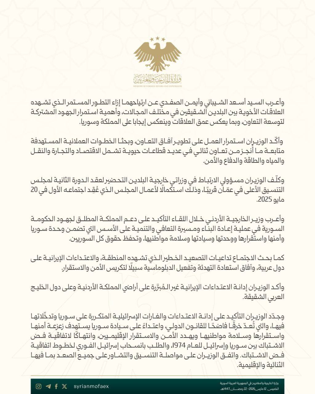 وزارة الخارجية والمغتربين السورية: بيان مشترك مع المملكة الأردنية الهاشمية حول تعزيز العلاقات الثنائية والتطورات الإقليمية
