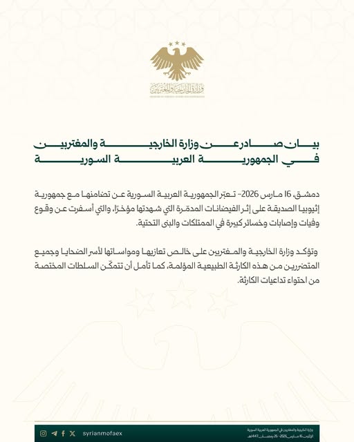 دمشق، 16 مارس 2026- تعبر الجمهورية العربية السورية عن تضامنها مع جمهورية إثيوبيا الصديقة على إثر الفيضانات المدمرة التي شهدتها مؤخراً، والتي أسفرت عن وقوع وفيات وإصابات وخسائر كبيرة في الممتلكات والبنى التحتية.