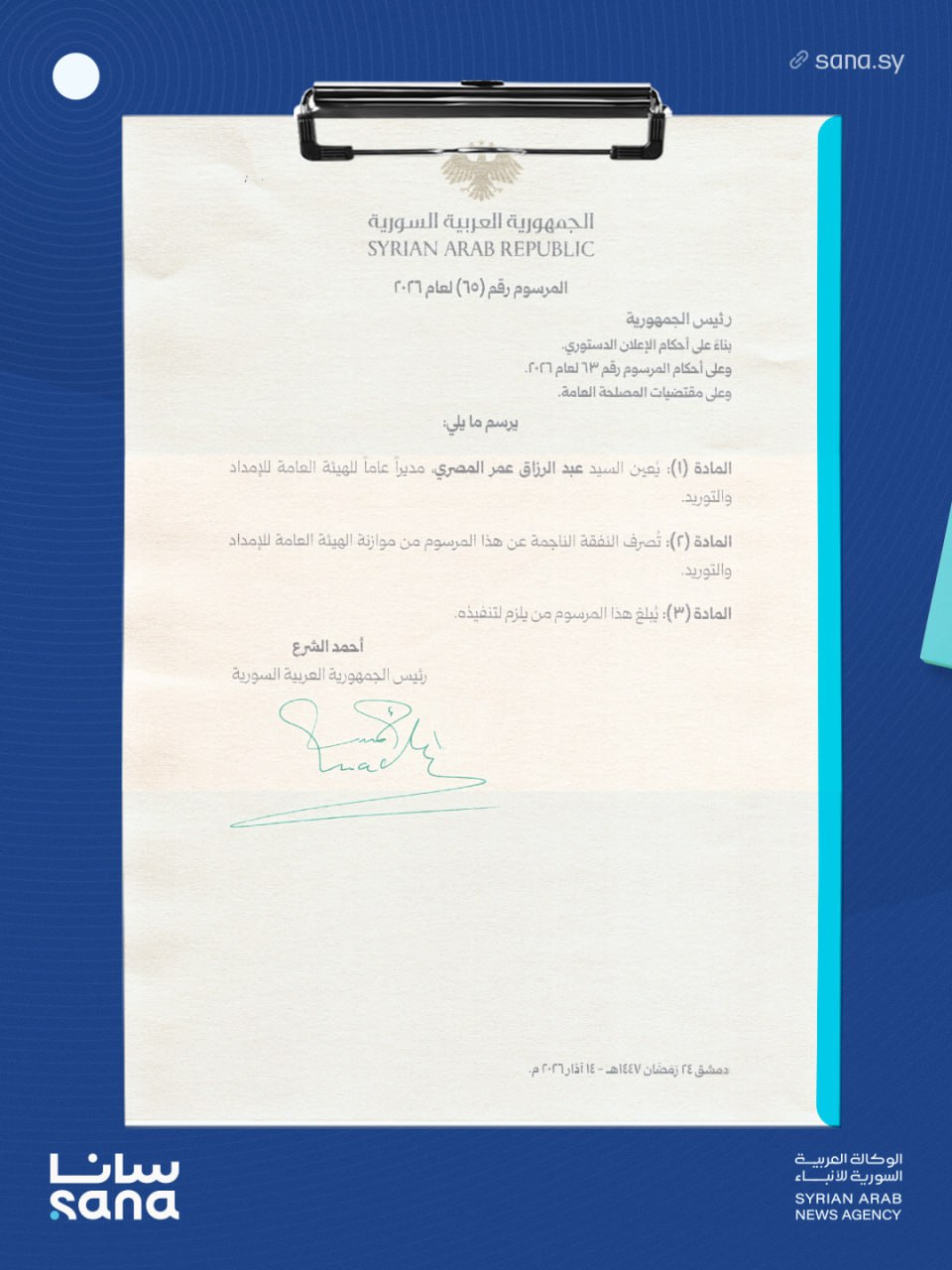 المرسوم 65 لعام 2026: تعيين عبد الرزاق عمر المصري مديراً عاماً للهيئة العامة للإمداد والتوريد