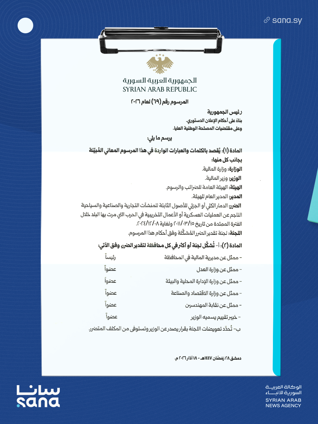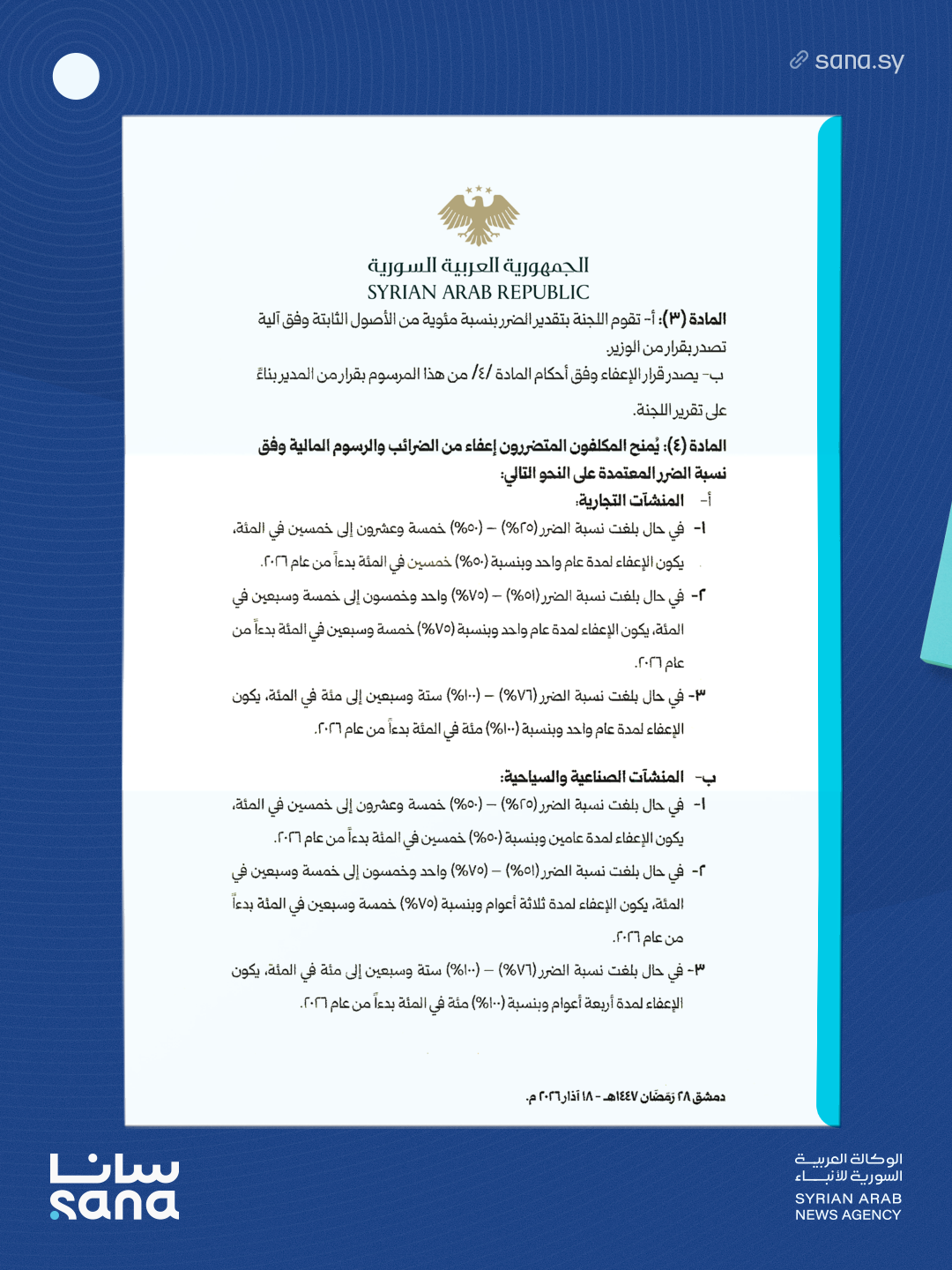المرسوم 69 لعام 2026: تشكيل لجان تقدير الضرر ومنح إعفاءات ضريبية ورسومية للمنشآت التجارية والصناعية والسياحية المتضررة