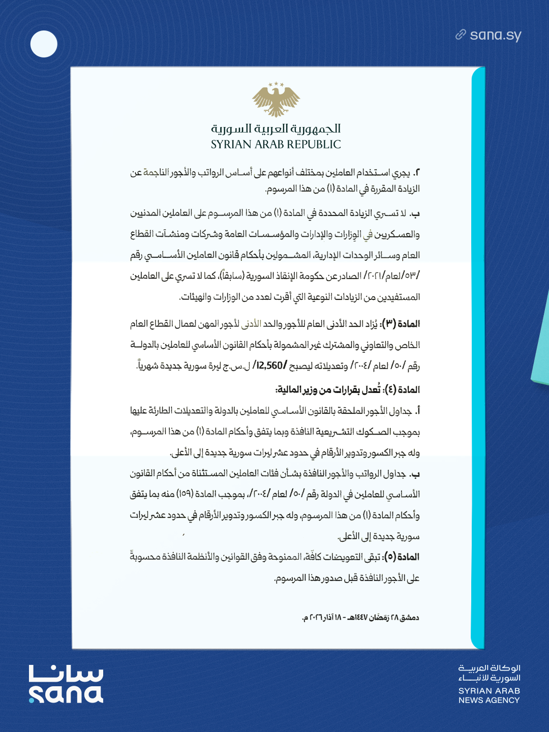 يُزاد الحد الأدنى العام للأجور والحد الأدنى لأجور المهن لعمال القطاع العام الخاص والتعاوني والمشترك غير المشمولة بأحكام القانون الأساسي للعاملين بالدولة رقم /50/ لعام /2004/ وتعديلاته ليصبح /12,560/ ل.س.ج ليرة سورية جديدة شهرياً.