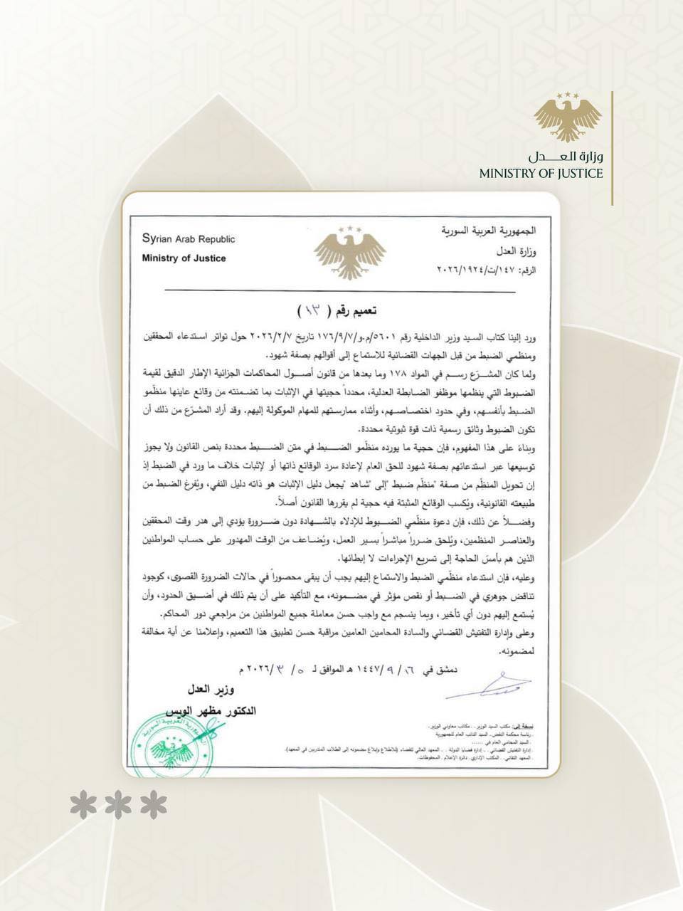 وزارة العدل: تعميم رقم 13 لعام 2026 يقيّد استدعاء منظمي الضبط كشهود