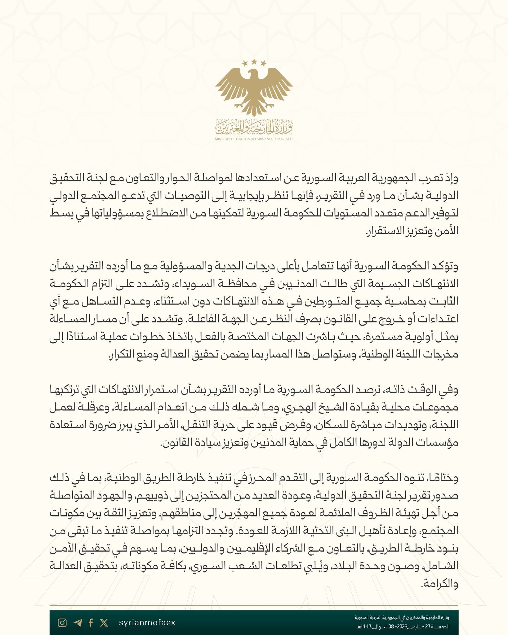 دمشق، 27 مارس 2026- تعرب وزارة الخارجية والمغتربين في الجمهورية العربية السورية عن تقديرها لجهود لجنة التحقيق الدولية المستقلة التي أصدرت تقريرها اليوم حول الأحداث الأليمة والمؤسفة التي شهدتها محافظة السويداء خلال شهري يوليو/آب 2025، وتؤكد أن الحكومة السورية تعاملت بأعلى درجات المسؤولية والشفافية مع هذه التطورات منذ اللحظة الأولى.