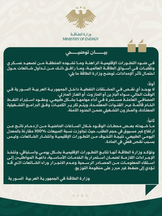 في ضوء التطورات الإقليمية الراهنة وما تشهده المنطقة من تصعيد عسكري وتقلّبات في أسواق الطاقة العالمية، وما رافق ذلك من تداول شائعات حول احتمال تأثر الإمدادات، توضح وزارة الطاقة ما يلي:
