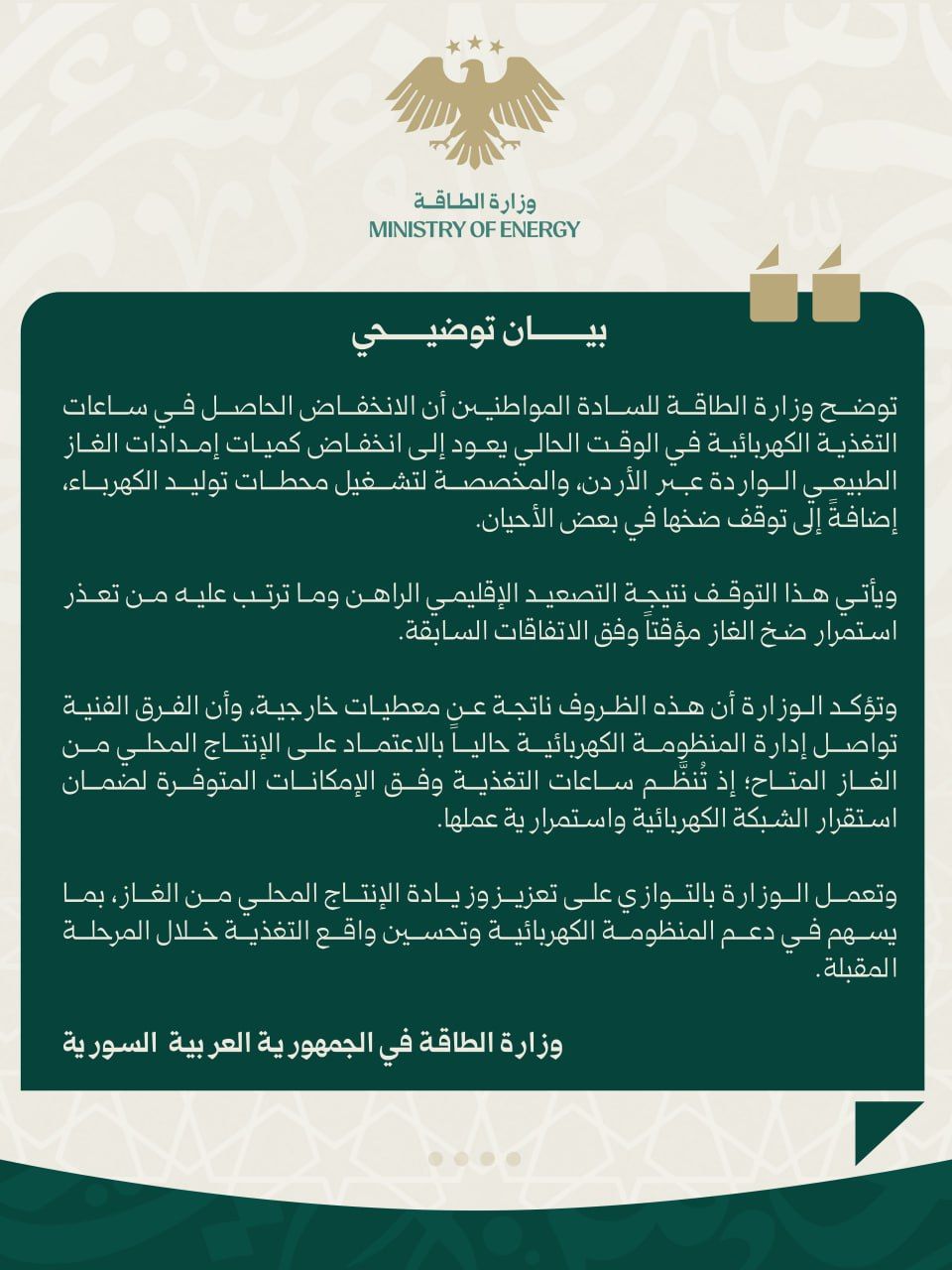 توضح وزارة الطاقة للسادة المواطنين أن الانخفاض الحاصل في ساعات التغذية الكهربائية في الوقت الحالي يعود إلى انخفاض كميات إمدادات الغاز الطبيعي الواردة عبر الأردن، والمخصصة لتشغيل محطات توليد الكهرباء، إضافة إلى توقف ضخها في بعض الأحيان.