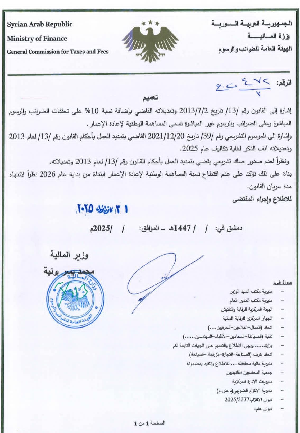 وإشارة إلى المرسوم التشريعي رقم /39/ تاريخ 20/12/2021 القاضي بتمديد العمل بأحكام القانون رقم /13/ لعام 2013 وتعديلاته آنفة الذكر لغاية تكاليف عام 2025.