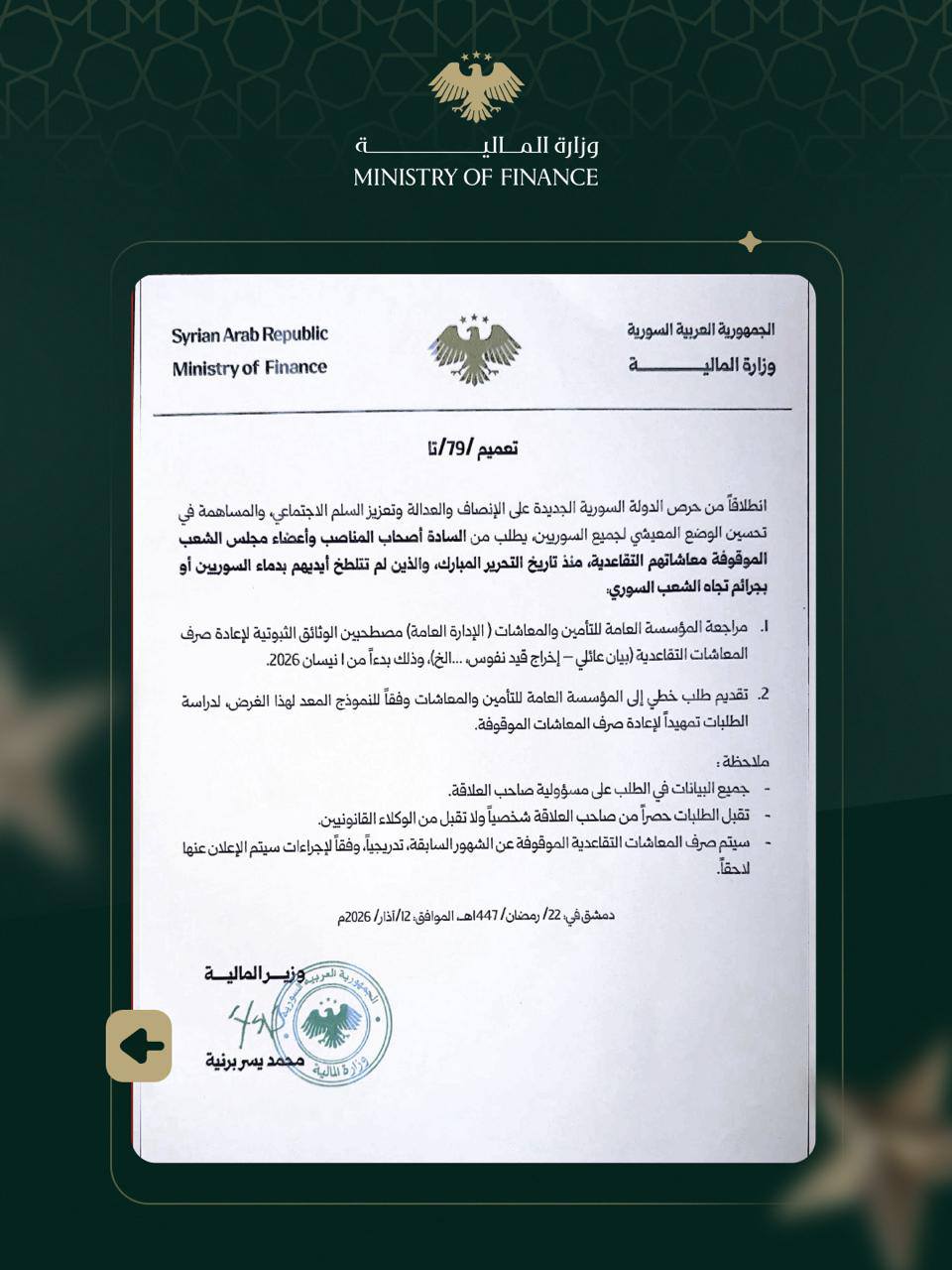 انطلاقاً من حرص الدولة السورية الجديدة على الإنصاف والعدالة وتعزيز السلم الاجتماعي، والمساهمة في تحسين الوضع المعيشي لجميع المواطنين، يُطلب من السادة أصحاب المناصب وأعضاء مجلس الشعب المتوقفة معاشاتهم التقاعدية منذ تاريخ التحرير المبارك، والذين لم تتلطخ أيديهم بدماء السوريين أو بجرائم تجاه الشعب السوري: