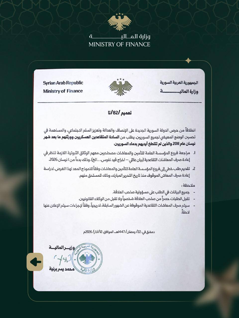 انطلاقاً من حرص الدولة السورية الجديدة على الإنصاف والعدالة وتعزيز السلم الاجتماعي والمساهمة في تحسين الوضع المعيشي لجميع السوريين، يُطلب من السادة المتقاعدين العسكريين ورثتهم ما بعد شهر نيسان عام 2011 والذين لم تتلطخ أيديهم بدماء السوريين: