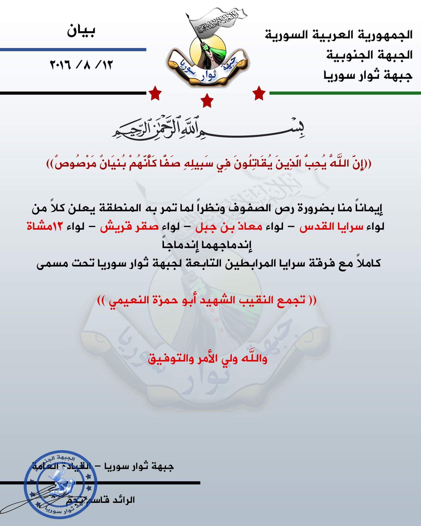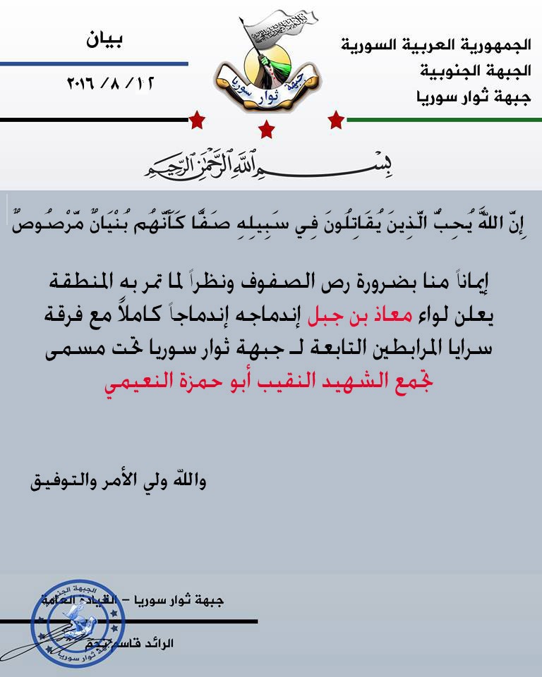 وتأسست كيانات عسكرية تابعة لإدارة التجمع مثل: "فوج الاستطلاع"، و "المكتب الأمني"، و "فوج م/د، لواء الدبابات"، "كتيبة الإشارة". وانضم كلًا من "لواء درع الشام"، و "لواء أسد الله"، و "فرقة الشهيد جميل أبو الزين شرف"، و "لواء عاصفة الحق"، و "لواء ابن تيمية"، و "كتيبة صقر قريش"، و "اللواء الثامن مشاة"، و "لواء أنصار السنة"، و "اللواء 12 مشاة"، و لواء سرايا المرابطين"، و "لواء سرايا القدس"، و "لواء معاذ بن جبل".